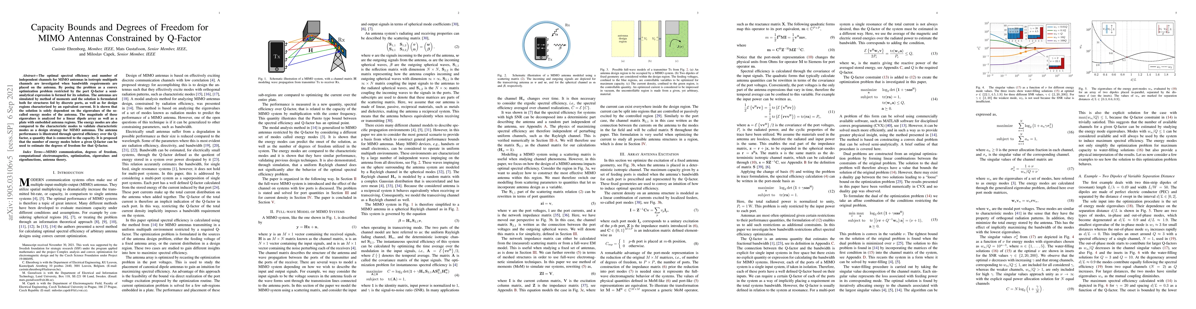 The optimal spectral efficiency and number of independent channels for MIMO antennas in isotropic multipath channels are investigated when bandwidth requirements are placed on the antenna. By posing the problem as a convex optimization problem restricted by the port Q-factor a semi-analytical expression is formed for its solution. The antennas are simulated by method of moments and the solution is formulated both for structures fed by discrete ports, as well as for design regions characterized by an equivalent current. It is shown that the solution is solely dependent on the eigenvalues of the so-called energy modes of the antenna. The magnitude of these eigenvalues is analyzed for a linear dipole array as well as a plate with embedded antenna regions. The energy modes are also compared to the characteristic modes to validate characteristic modes as a design strategy for MIMO antennas. The antenna performance is illustrated through spectral efficiency over the Q-factor, a quantity that is connected to the capacity. It is proposed that the number of energy modes below a given Q-factor can be used to estimate the degrees of freedom for that Q-factor.