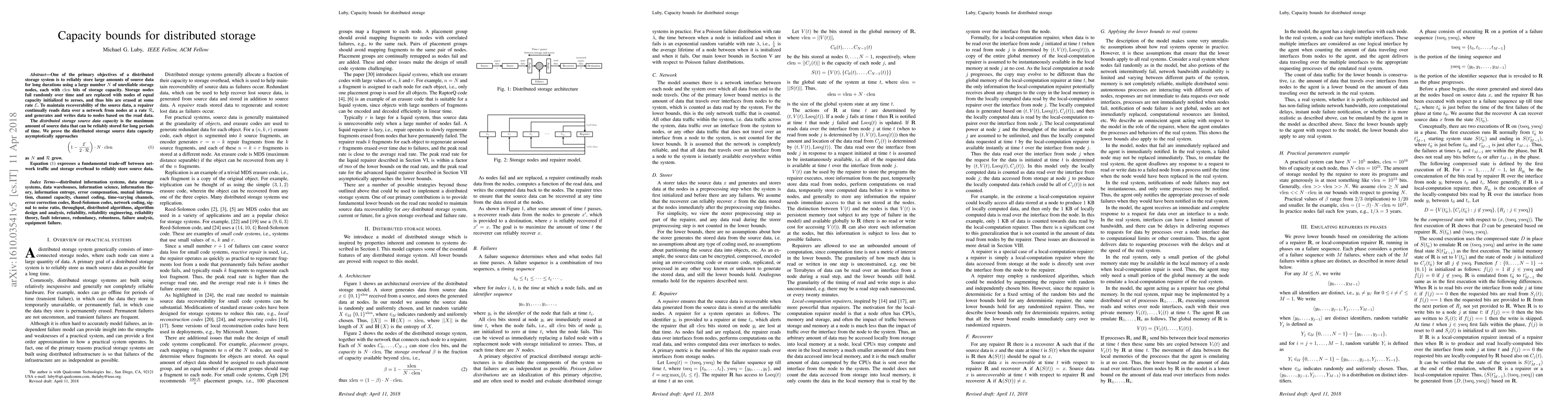 This paper establishes the asymptotic capacity bound for distributed storage systems, showing that the maximum reliable storage approaches $\left(1-\frac{E}{2 \cdot R}\right) \cdot N \cdot c$ as the number of nodes and repair rate increase, highlighting the trade-off between network traffic and storage overhead.
