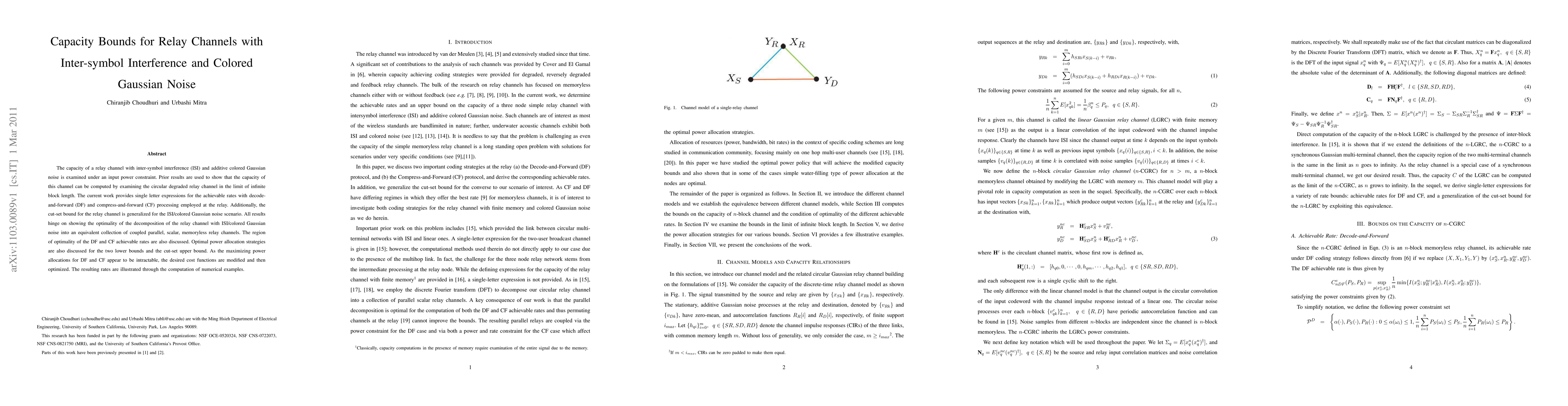 This paper investigates the capacity bounds for relay channels with inter-symbol interference and colored Gaussian noise, deriving single letter expressions for achievable rates under decode-and-forward and compress-and-forward processing. It generalizes the cut-set bound and discusses optimal power allocation strategies, providing numerical examples to illustrate the results.