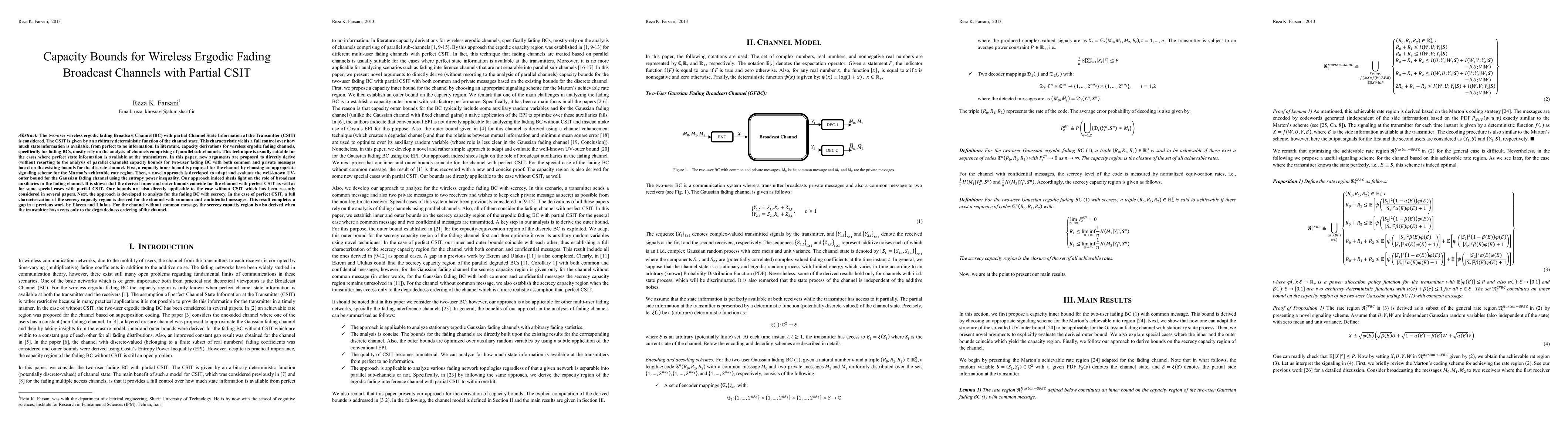 The two-user wireless ergodic fading Broadcast Channel (BC) with partial Channel State Information at the Transmitter (CSIT) is considered. The CSIT is given by an arbitrary deterministic function of the channel state. This characteristic yields a full control over how much state information is available, from perfect to no information. In literature, capacity derivations for wireless ergodic fading channels, specifically for fading BCs, mostly rely on the analysis of channels comprising of parallel sub-channels. This technique is usually suitable for the cases where perfect state information is available at the transmitters. In this paper, new arguments are proposed to directly derive (without resorting to the analysis of parallel channels) capacity bounds for the two-user fading BC with both common and private messages based on the existing bounds for the discrete channel. Specifically, a novel approach is developed to adapt and evaluate the well-known UV-outer bound for the Gaussian fading channel using the entropy power inequality. Our approach indeed sheds light on the role of broadcast auxiliaries in the fading channel. It is shown that the derived outer bound is optimal for the channel with perfect CSIT as well as for some special cases with partial CSIT. Our outer bound is also directly applicable to the case without CSIT which has been recently considered in several papers. Next, the approach is developed to analyze for the fading BC with secrecy. In the case of perfect CSIT, a full characterization of the secrecy capacity region is derived for the channel with common and confidential messages. This result completes a gap in a previous work by Ekrem and Ulukus. For the channel without common message, the secrecy capacity region is also derived when the transmitter has access only to the degradedness ordering of the channel.