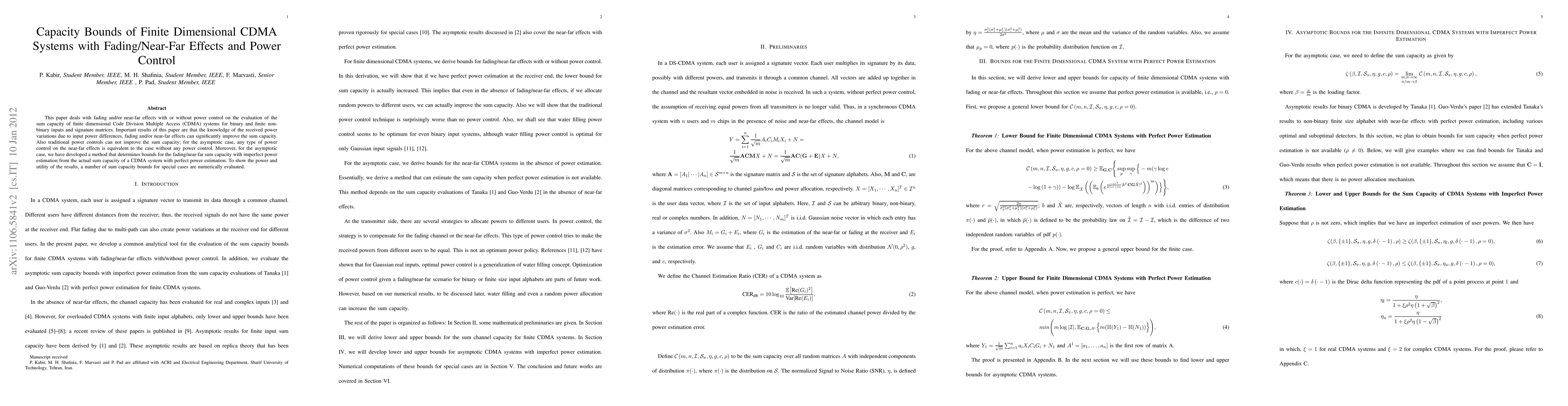 This paper evaluates the sum capacity of finite dimensional CDMA systems under fading and near-far effects, demonstrating that knowledge of power variations can significantly enhance capacity. It concludes that traditional power controls are ineffective for improving sum capacity, and proposes a method for determining bounds for fading/near-far sum capacity with imperfect power estimation.