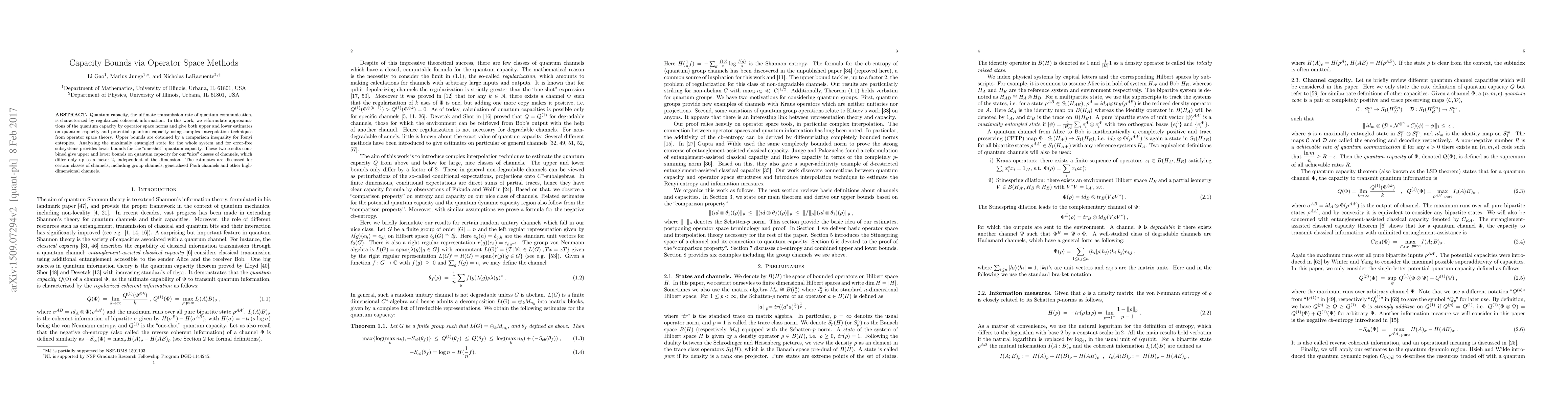 Quantum capacity, as the ultimate transmission rate of quantum communication, is characterized by regularized coherent information. In this work, we reformulate approximations of the quantum capacity by operator space norms and give both upper and lower bounds on quantum capacity, and potential quantum capacity using interpolation techniques. We identify a situation in which nice classes of channels satisfy a "comparison property" on entropy, coherent information and capacities. The paradigms for our estimates are so-called conditional expectations. These generally non-degradable channels admit a strongly additive expression for $Q^{(1)}$. We also identify conditions on channels showing that the "hashing bound" is optimal for the cb-entropy. These two estimates combined give upper and lower bounds on quantum capacity on our "nice" classes of channels, which differ only up to a factor 2, independent of the dimension. The estimates are discussed for certain classes of channels, including group channels, Pauli channels and other high-dimensional channels.
