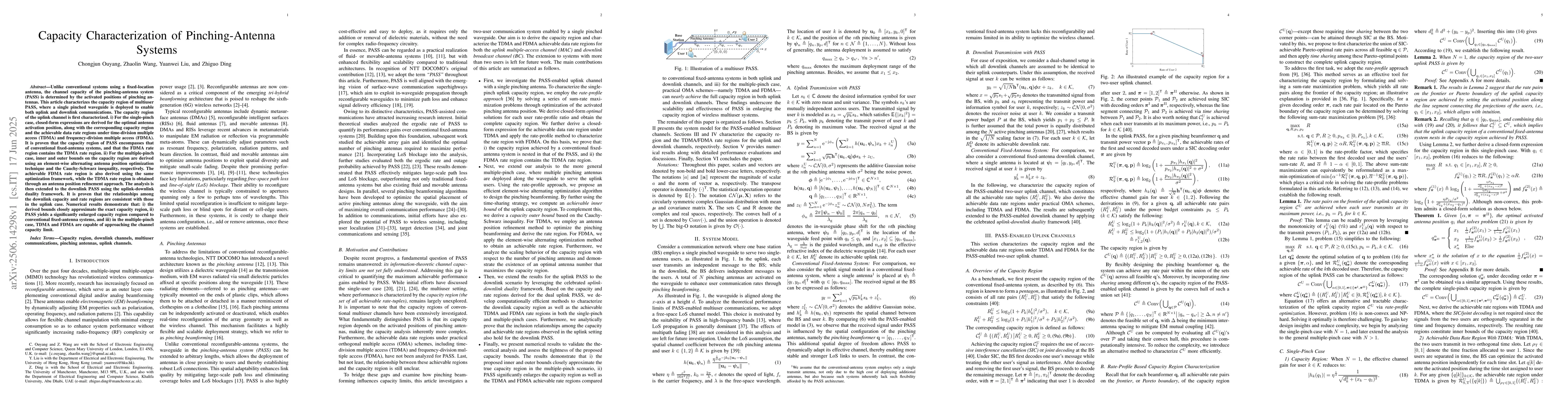 Unlike conventional systems using a fixed-location antenna, the channel capacity of the pinching-antenna system (PASS) is determined by the activated positions of pinching antennas. This article characterizes the capacity region of multiuser PASS, where a single pinched waveguide is deployed to enable both uplink and downlink communications. The capacity region of the uplink channel is first characterized. \romannumeral1) For the single-pinch case, closed-form expressions are derived for the optimal antenna activation position, along with the corresponding capacity region and the achievable data rate regions under time-division multiple access (TDMA) and frequency-division multiple access (FDMA). It is proven that the capacity region of PASS encompasses that of conventional fixed-antenna systems, and that the FDMA rate region contains the TDMA rate region. \romannumeral2) For the multiple-pinch case, inner and outer bounds on the capacity region are derived using an element-wise alternating antenna position optimization technique and the Cauchy-Schwarz inequality, respectively. The achievable FDMA rate region is also derived using the same optimization framework, while the TDMA rate region is obtained through an antenna position refinement approach. The analysis is then extended to the downlink PASS using the uplink-downlink duality framework. It is proven that the relationships among the downlink capacity and rate regions are consistent with those in the uplink case. Numerical results demonstrate that: \romannumeral1) the derived bounds closely approximate the exact capacity region, \romannumeral2) PASS yields a significantly enlarged capacity region compared to conventional fixed-antenna systems, and \romannumeral3) in the multiple-pinch case, TDMA and FDMA are capable of approaching the channel capacity limit.