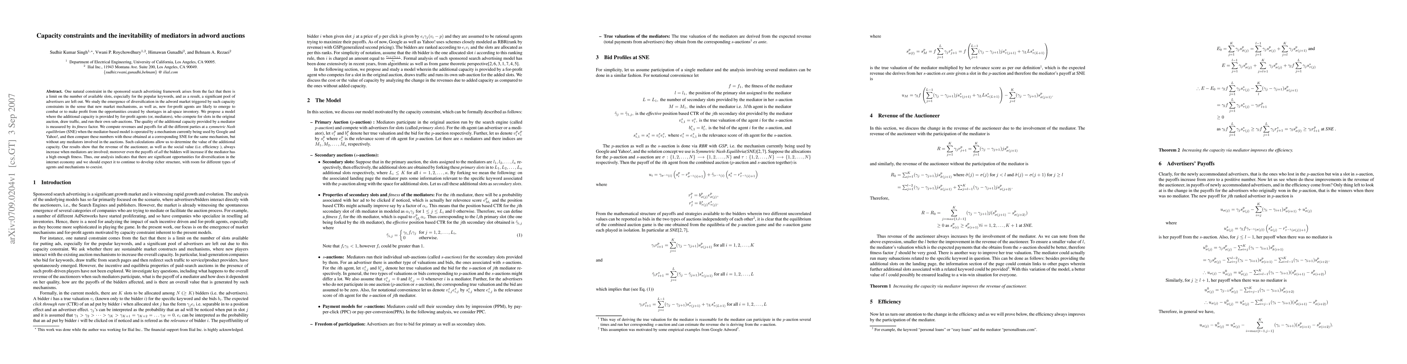 One natural constraint in the sponsored search advertising framework arises from the fact that there is a limit on the number of available slots, especially for the popular keywords, and as a result, a significant pool of advertisers are left out. We study the emergence of diversification in the adword market triggered by such capacity constraints in the sense that new market mechanisms, as well as, new for-profit agents are likely to emerge to combat or to make profit from the opportunities created by shortages in ad-space inventory. We propose a model where the additional capacity is provided by for-profit agents (or, mediators), who compete for slots in the original auction, draw traffic, and run their own sub-auctions. The quality of the additional capacity provided by a mediator is measured by its {\it fitness} factor. We compute revenues and payoffs for all the different parties at a {\it symmetric Nash equilibrium} (SNE) when the mediator-based model is operated by a mechanism currently being used by Google and Yahoo!, and then compare these numbers with those obtained at a corresponding SNE for the same mechanism, but without any mediators involved in the auctions. Such calculations allow us to determine the value of the additional capacity. Our results show that the revenue of the auctioneer, as well as the social value (i.e. efficiency), always increase when mediators are involved; moreover even the payoffs of {\em all} the bidders will increase if the mediator has a high enough fitness. Thus, our analysis indicates that there are significant opportunities for diversification in the internet economy and we should expect it to continue to develop richer structure, with room for different types of agents and mechanisms to coexist.