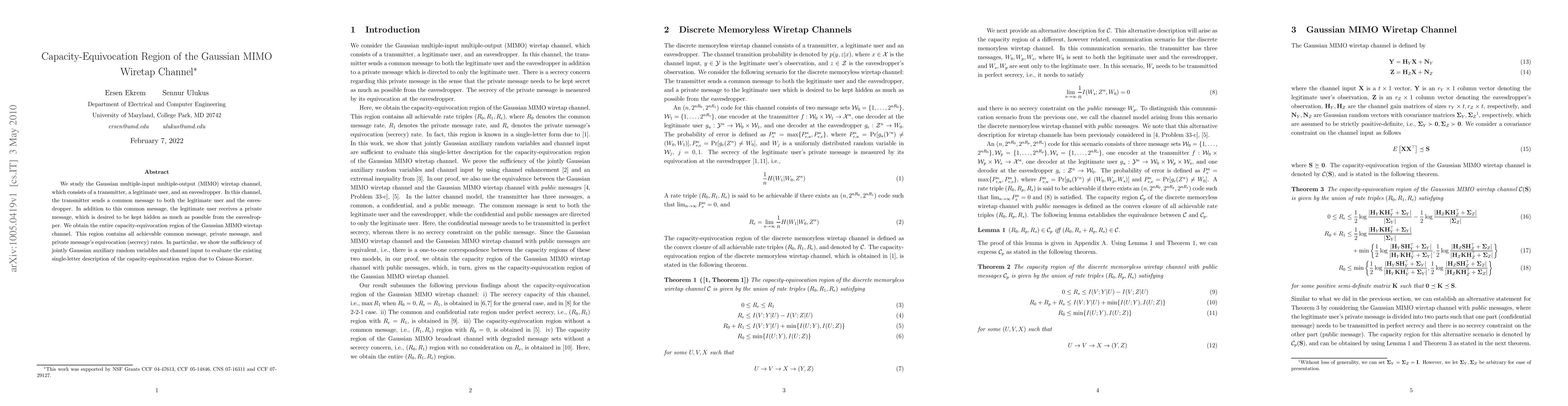 This paper investigates the Gaussian MIMO wiretap channel, determining the complete capacity-equivocation region, which encompasses all achievable rates for common and private messages, as well as the equivocation (secrecy) rate for the private message. It demonstrates the sufficiency of jointly Gaussian auxiliary variables for evaluating the region.