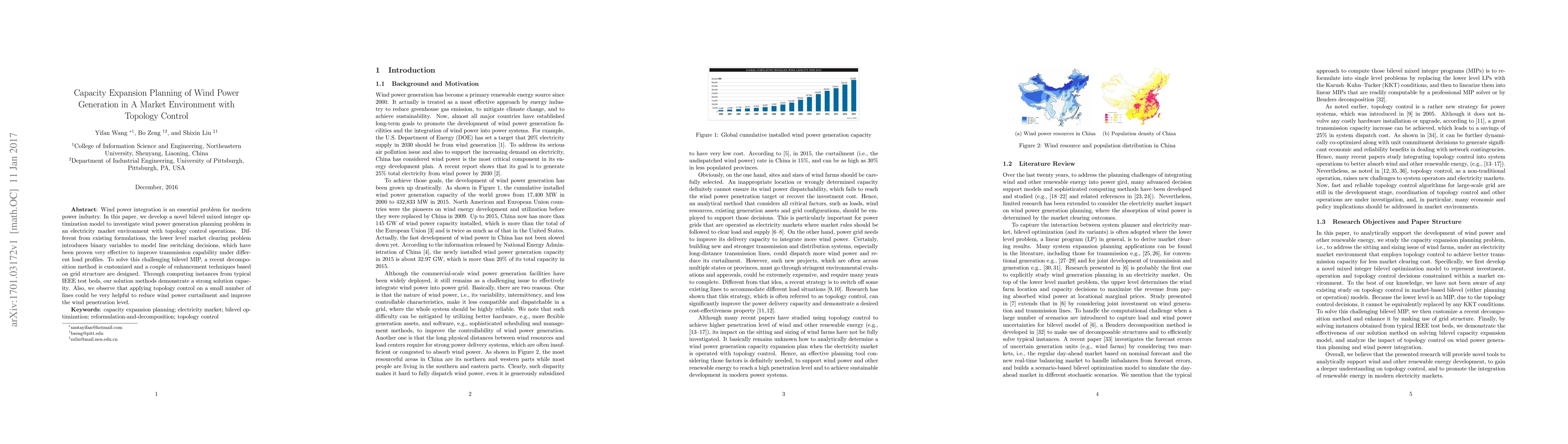 This paper develops a bilevel mixed integer optimization model for wind power generation planning in an electricity market with topology control. It introduces binary variables for line switching decisions to enhance transmission capability, and employs a customized decomposition method to solve the model, demonstrating effective reduction in wind power curtailment and improved wind penetration.