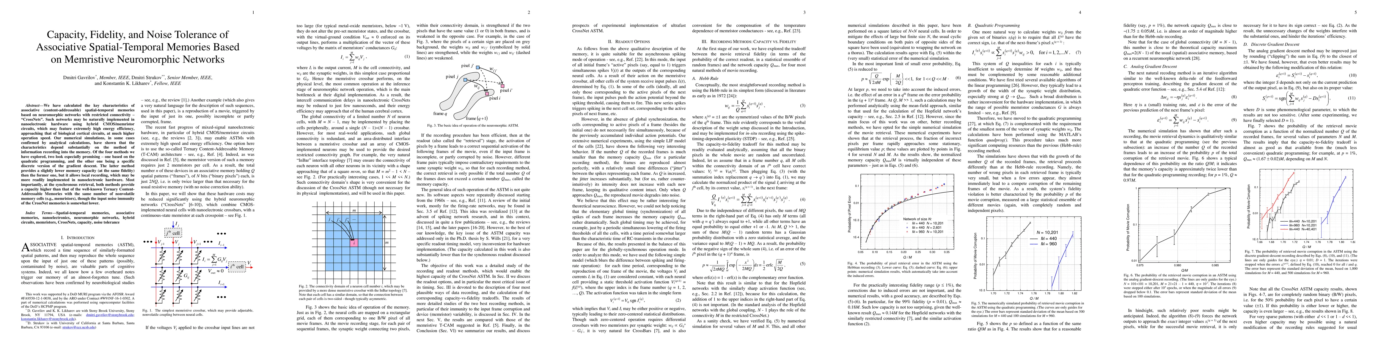 This paper evaluates the capacity, fidelity, and noise tolerance of associative spatial-temporal memories in neuromorphic networks called CrossNets, finding that two specific recording methods—quadratic programming and a discrete gradient descent—show promising results. The gradient descent method, though slightly lower in capacity, offers local recording suitable for nanoelectronic hardware.