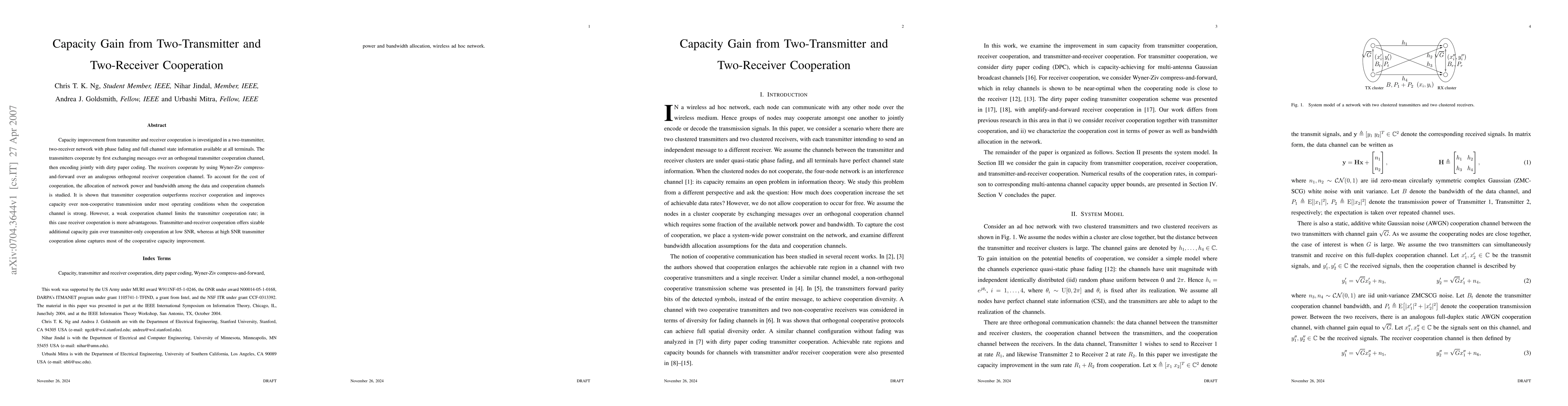 This paper explores capacity gains in a two-transmitter, two-receiver network through transmitter and receiver cooperation, showing that transmitter cooperation generally outperforms receiver cooperation, especially when the cooperation channel is strong. However, under weak cooperation channels, receiver cooperation becomes more beneficial.