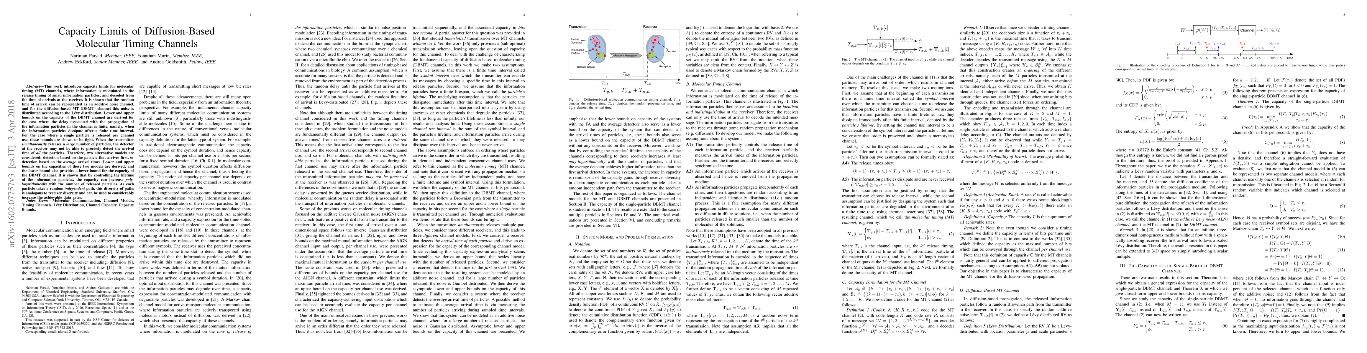 This paper derives capacity limits for diffusion-based molecular timing channels, showing that the arrival times of information particles follow an L\'evy distribution. It establishes tight bounds for both single and multiple particle releases, demonstrating that capacity can increase with the number of particles through path diversity.
