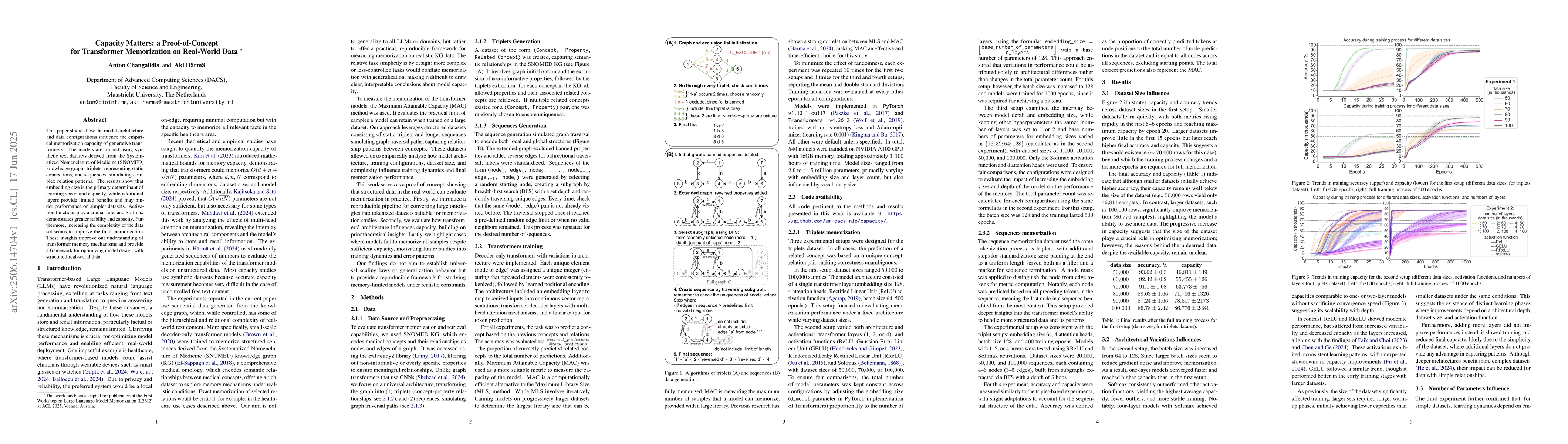 This paper studies how the model architecture and data configurations influence the empirical memorization capacity of generative transformers. The models are trained using synthetic text datasets derived from the Systematized Nomenclature of Medicine (SNOMED) knowledge graph: triplets, representing static connections, and sequences, simulating complex relation patterns. The results show that embedding size is the primary determinant of learning speed and capacity, while additional layers provide limited benefits and may hinder performance on simpler datasets. Activation functions play a crucial role, and Softmax demonstrates greater stability and capacity. Furthermore, increasing the complexity of the data set seems to improve the final memorization. These insights improve our understanding of transformer memory mechanisms and provide a framework for optimizing model design with structured real-world data.
