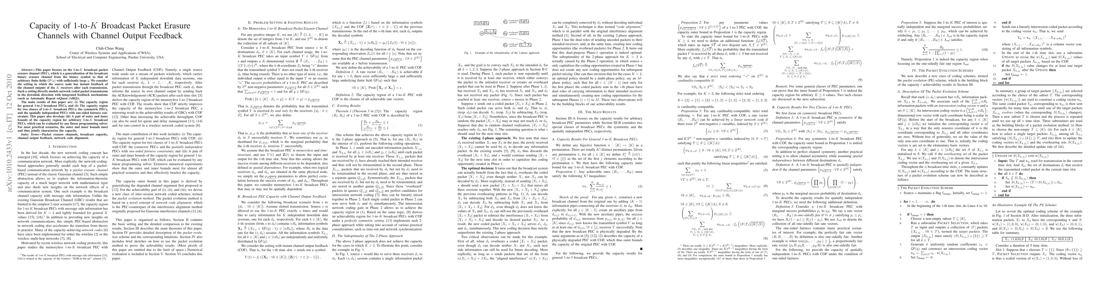 This paper explores the capacity region for 1-to-K broadcast packet erasure channels with channel output feedback, providing results for general 1-to-3 channels and specific symmetric and spatially independent cases. It also develops linear programming bounds that characterize the capacity region for arbitrary 1-to-K scenarios.