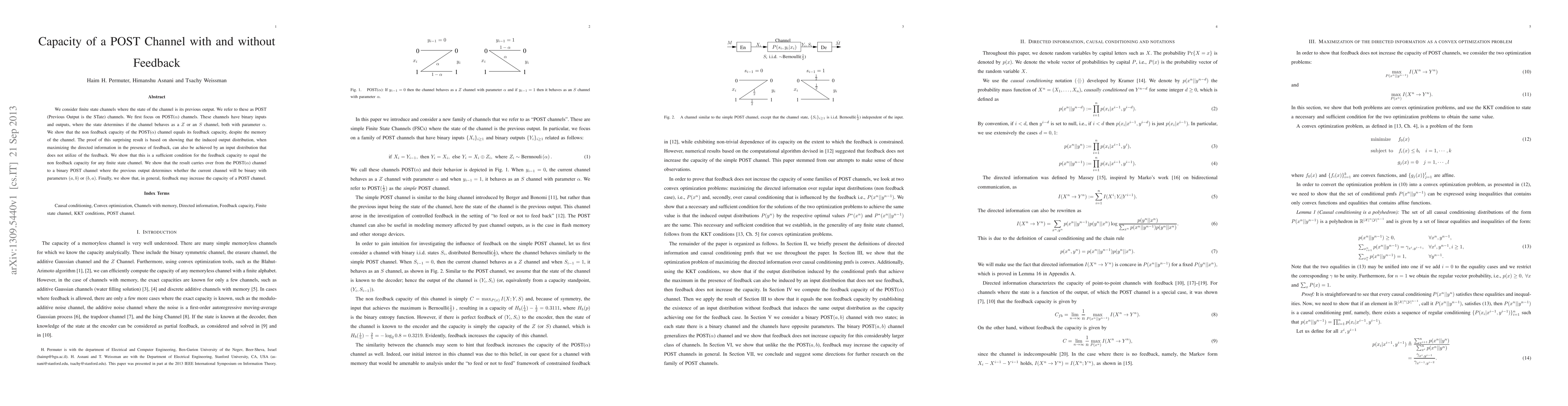 This paper investigates the capacity of POST channels, which have memory based on their previous output, and finds that the non-feedback capacity equals the feedback capacity for specific POST($\alpha$) channels. The surprising result is shown through the equivalence of output distributions under feedback and non-feedback conditions.