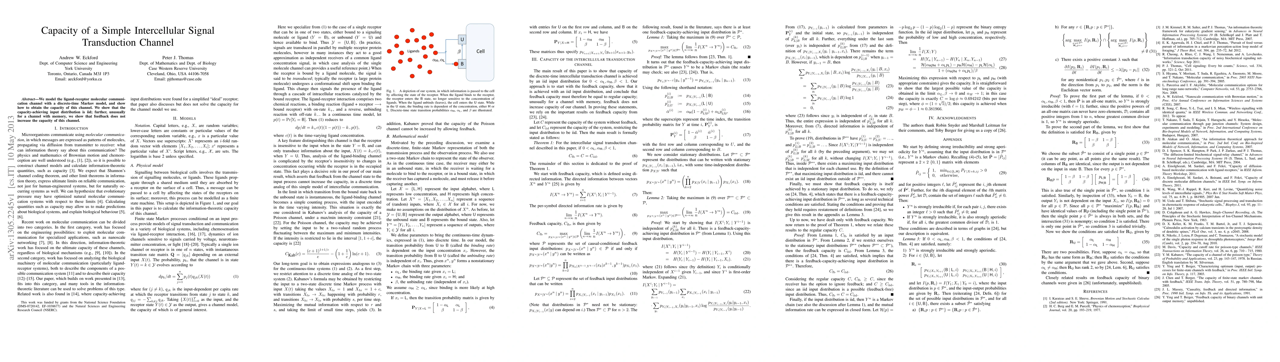 This paper models a ligand-receptor communication channel using a discrete-time Markov model and demonstrates that the channel's maximum capacity is achieved with an iid input distribution. Notably, the study finds that feedback does not enhance the channel's capacity, contrary to channels with memory.