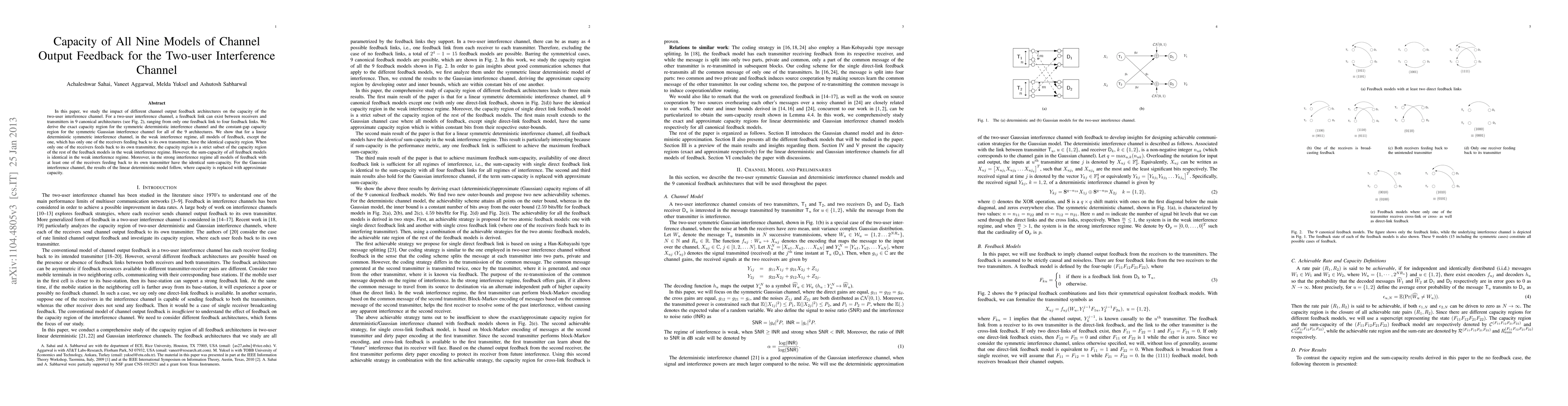 The paper investigates 9 different channel output feedback architectures for a two-user interference channel, finding that some models have identical capacity regions in the weak interference regime and identical sum-capacity in both regimes.