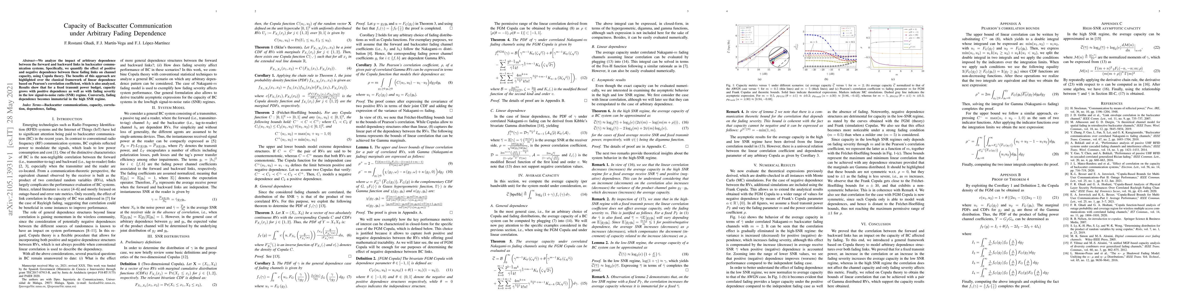 We analyze the impact of arbitrary dependence between the forward and backward links in backscatter communication systems. Specifically, we quantify the effect of positive and negative dependence between these fading links on channel capacity, using Copula theory. The benefits of this approach are highlighted over the classical framework of linear dependence based on Pearson's correlation coefficient, which is also analyzed. Results show that for a fixed transmit power budget, capacity grows with positive dependence as well as with fading severity in the low signal-to-noise ratio (SNR) regime. Conversely, fading dependence becomes immaterial in the high SNR regime.