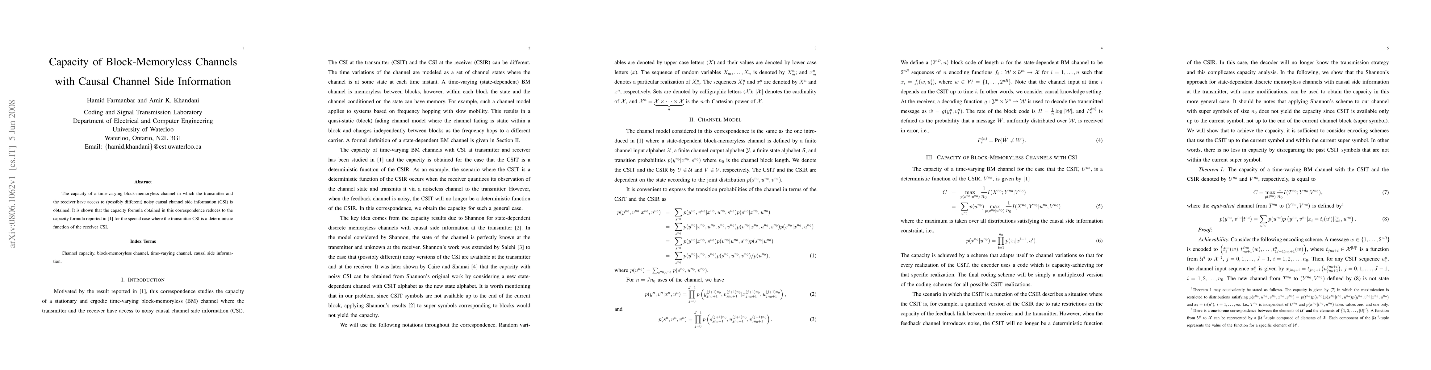 Researchers found that a time-varying block-memoryless channel's capacity is calculated using noisy causal channel side information, reducing to the known capacity formula for special cases.