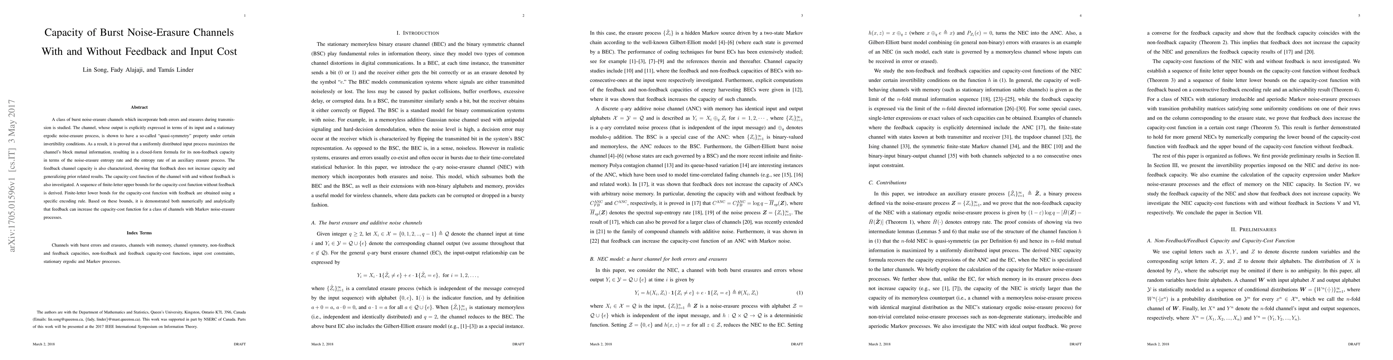 This paper studies burst noise-erasure channels with both errors and erasures, proving that uniformly distributed inputs maximize block mutual information and deriving a closed-form formula for non-feedback capacity. It also shows that feedback does not increase capacity and provides bounds for the capacity-cost function, demonstrating that feedback can enhance it for channels with Markov noise-erasure processes.