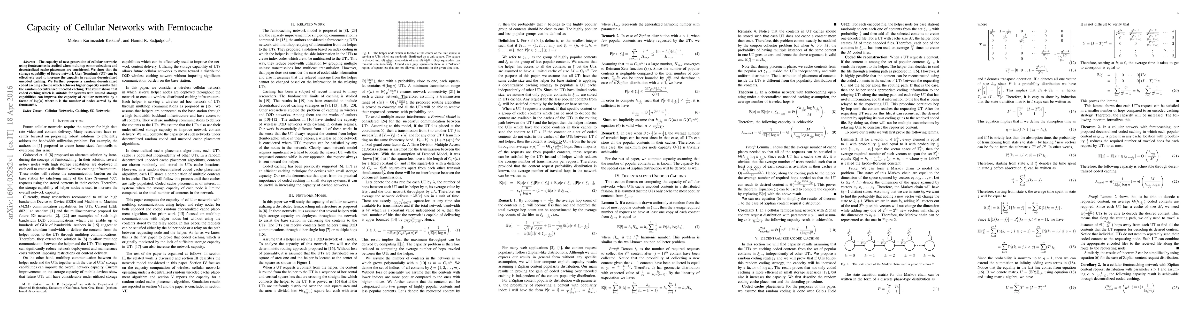 The capacity of next generation of cellular networks using femtocaches is studied when multihop communications and decentralized cache placement are considered. We show that the storage capability of future network User Terminals (UT) can be effectively used to increase the capacity in random decentralized uncoded caching. We further propose a random decentralized coded caching scheme which achieves higher capacity results than the random decentralized uncoded caching. The result shows that coded caching which is suitable for systems with limited storage capabilities can improve the capacity of cellular networks by a factor of log(n) where n is the number of nodes served by the femtocache.