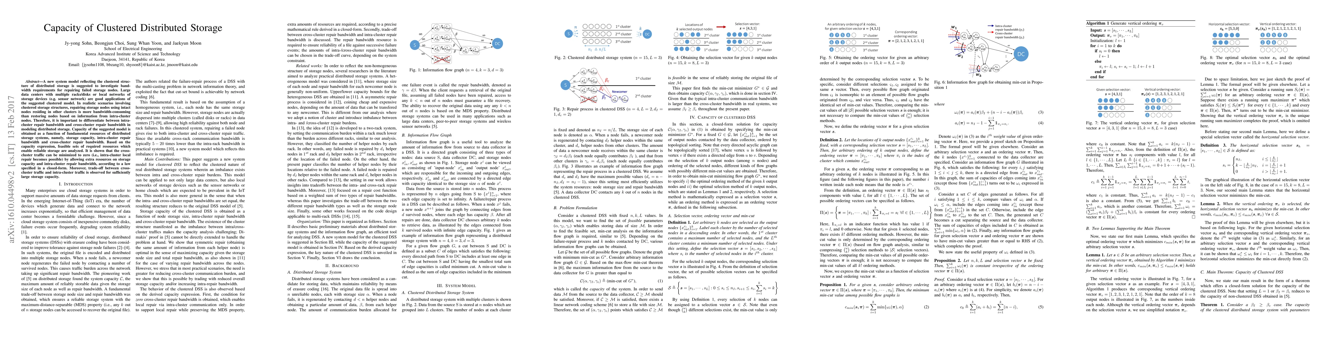 A new system model reflecting the clustered structure of distributed storage is suggested to investigate bandwidth requirements for repairing failed storage nodes. Large data centers with multiple racks/disks or local networks of storage devices (e.g. sensor network) are good applications of the suggested clustered model. In realistic scenarios involving clustered storage structures, repairing storage nodes using intact nodes residing in other clusters is more bandwidth-consuming than restoring nodes based on information from intra-cluster nodes. Therefore, it is important to differentiate between intra-cluster repair bandwidth and cross-cluster repair bandwidth in modeling distributed storage. Capacity of the suggested model is obtained as a function of fundamental resources of distributed storage systems, namely, storage capacity, intra-cluster repair bandwidth and cross-cluster repair bandwidth. Based on the capacity expression, feasible sets of required resources which enable reliable storage are analyzed. It is shown that the cross-cluster traffic can be minimized to zero (i.e., intra-cluster local repair becomes possible) by allowing extra resources on storage capacity and intra-cluster repair bandwidth, according to a law specified in a closed-form. Moreover, trade-off between cross-cluster traffic and intra-cluster traffic is observed for sufficiently large storage capacity.