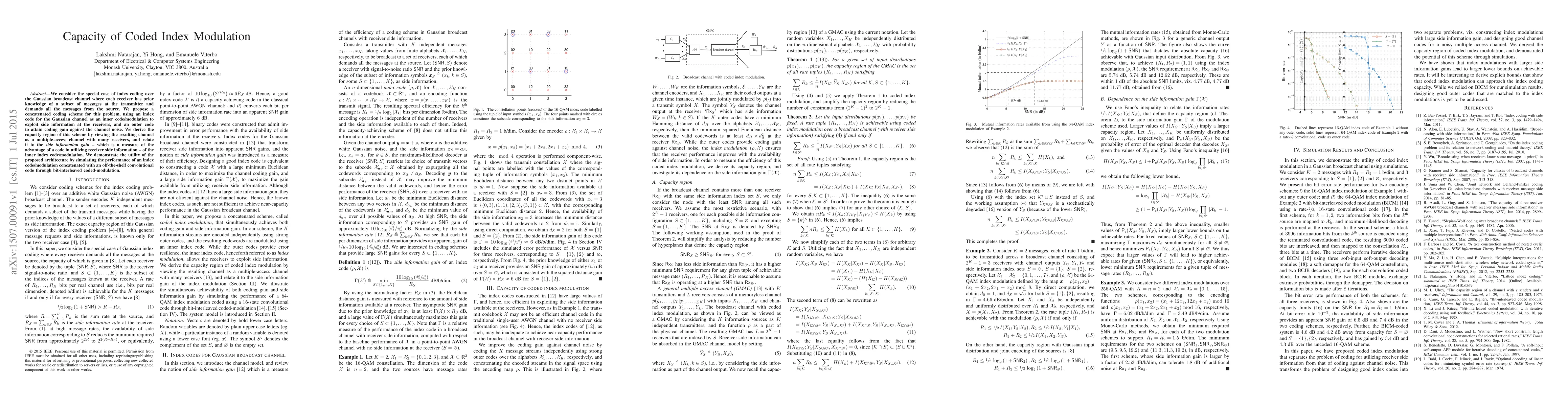 We consider the special case of index coding over the Gaussian broadcast channel where each receiver has prior knowledge of a subset of messages at the transmitter and demands all the messages from the source. We propose a concatenated coding scheme for this problem, using an index code for the Gaussian channel as an inner code/modulation to exploit side information at the receivers, and an outer code to attain coding gain against the channel noise. We derive the capacity region of this scheme by viewing the resulting channel as a multiple-access channel with many receivers, and relate it to the 'side information gain' -- which is a measure of the advantage of a code in utilizing receiver side information -- of the inner index code/modulation. We demonstrate the utility of the proposed architecture by simulating the performance of an index code/modulation concatenated with an off-the-shelf convolutional code through bit-interleaved coded-modulation.