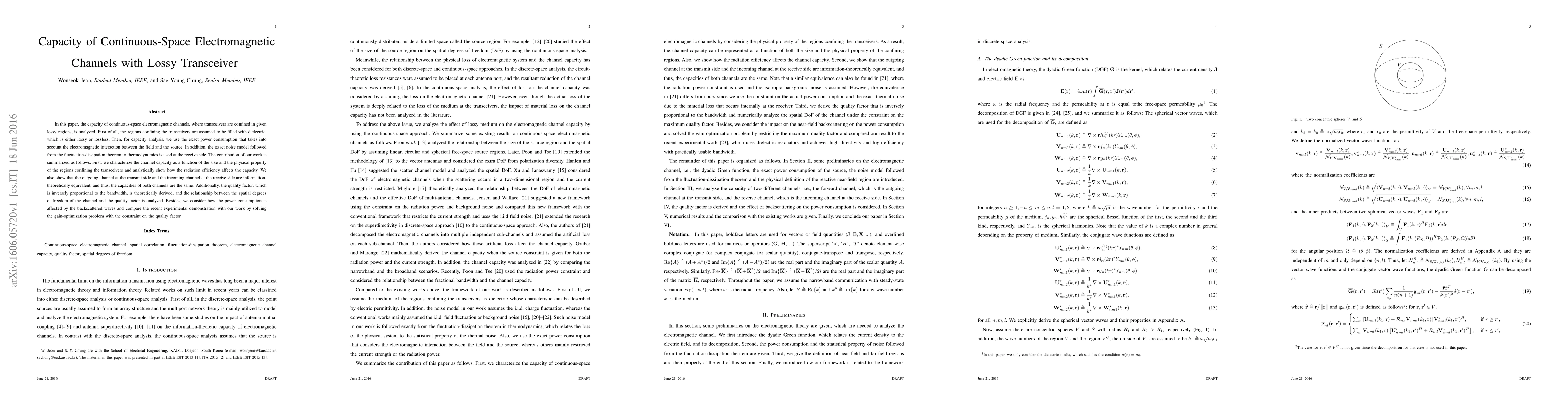 This paper analyzes the capacity of continuous-space electromagnetic channels with transceivers confined in lossy dielectric regions, focusing on the impact of radiation efficiency and the equivalence of transmit and receive channels. It derives the quality factor and examines the relationship between spatial degrees of freedom and power consumption, including backscattered waves.