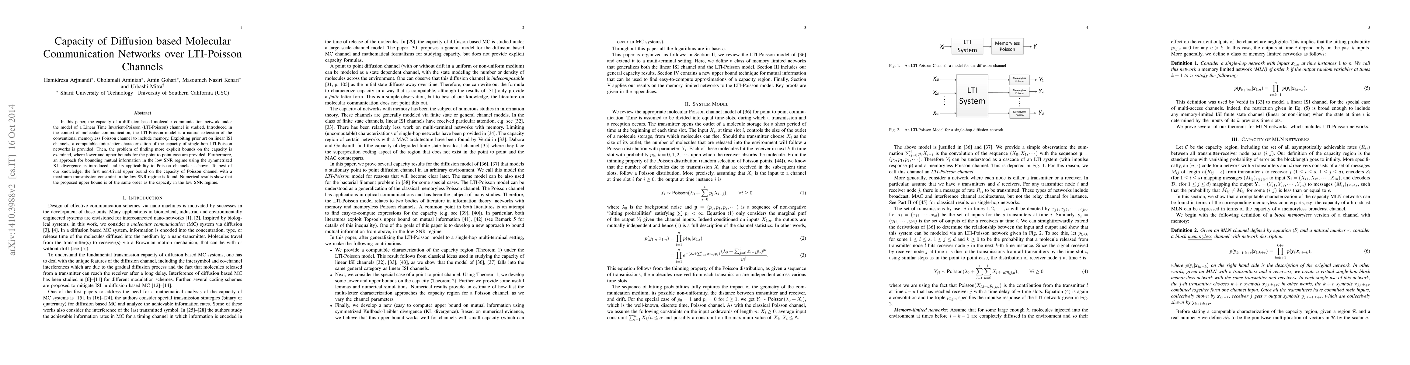 In this paper, the capacity of a diffusion based molecular communication network under the model of a Linear Time Invarient-Poisson (LTI-Poisson) channel is studied. Introduced in the context of molecular communication, the LTI-Poisson model is a natural extension of the conventional memoryless Poisson channel to include memory. Exploiting prior art on linear ISI channels, a computable finite-letter characterization of the capacity of single-hop LTI-Poisson networks is provided. Then, the problem of finding more explicit bounds on the capacity is examined, where lower and upper bounds for the point to point case are provided. Furthermore, an approach for bounding mutual information in the low SNR regime using the symmetrized KL divergence is introduced and its applicability to Poisson channels is shown. To best of our knowledge, the first non-trivial upper bound on the capacity of Poisson channel with a maximum transmission constraint in the low SNR regime is found. Numerical results show that the proposed upper bound is of the same order as the capacity in the low SNR regime.