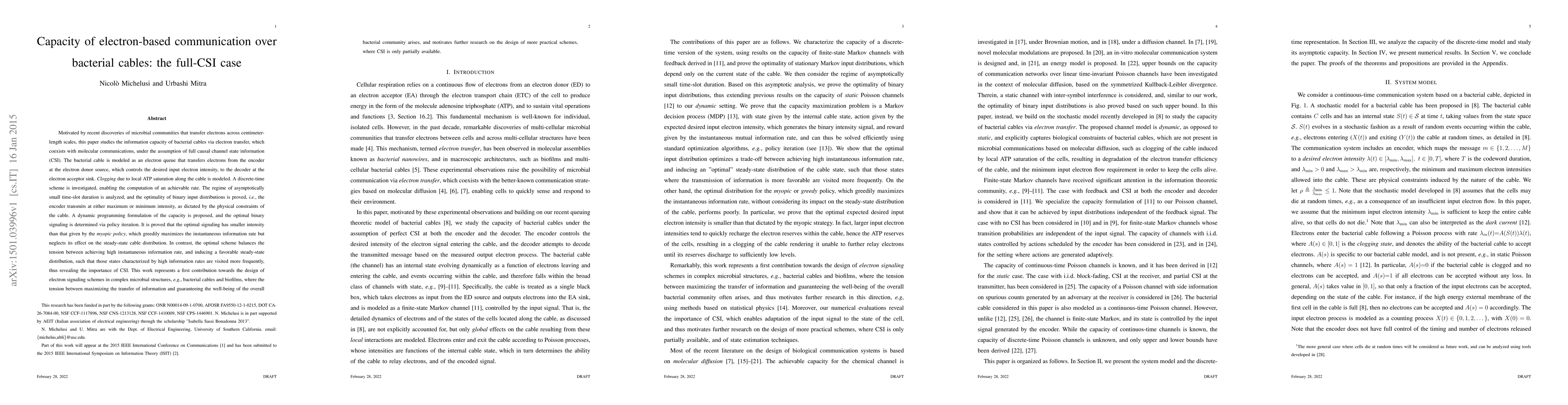 Motivated by recent discoveries of microbial communities that transfer electrons across centimeter-length scales, this paper studies the information capacity of bacterial cables via electron transfer, which coexists with molecular communications, under the assumption of full causal channel state information (CSI). The bacterial cable is modeled as an electron queue that transfers electrons from the encoder at the electron donor source, which controls the desired input electron intensity, to the decoder at the electron acceptor sink. Clogging due to local ATP saturation along the cable is modeled. A discrete-time scheme is investigated, enabling the computation of an achievable rate. The regime of asymptotically small time-slot duration is analyzed, and the optimality of binary input distributions is proved, i.e., the encoder transmits at either maximum or minimum intensity, as dictated by the physical constraints of the cable. A dynamic programming formulation of the capacity is proposed, and the optimal binary signaling is determined via policy iteration. It is proved that the optimal signaling has smaller intensity than that given by the myopic policy, which greedily maximizes the instantaneous information rate but neglects its effect on the steady-state cable distribution. In contrast, the optimal scheme balances the tension between achieving high instantaneous information rate, and inducing a favorable steady-state distribution, such that those states characterized by high information rates are visited more frequently, thus revealing the importance of CSI. This work represents a first contribution towards the design of electron signaling schemes in complex microbial structures, e.g., bacterial cables and biofilms, where the tension between maximizing the transfer of information and guaranteeing the well-being of the overall bacterial community arises.