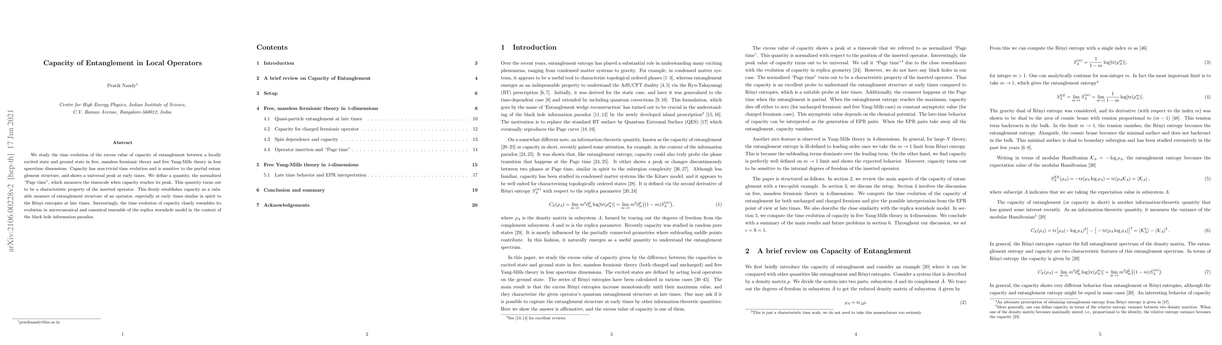 We study the time evolution of the excess value of capacity of entanglement between a locally excited state and ground state in free, massless fermionic theory and free Yang-Mills theory in four spacetime dimensions. Capacity has non-trivial time evolution and is sensitive to the partial entanglement structure, and shows a universal peak at early times. We define a quantity, the normalized "Page time", which measures the timescale when capacity reaches its peak. This quantity turns out to be a characteristic property of the inserted operator. This firmly establishes capacity as a valuable measure of entanglement structure of an operator, especially at early times similar in spirit to the Renyi entropies at late times. Interestingly, the time evolution of capacity closely resembles its evolution in microcanonical and canonical ensemble of the replica wormhole model in the context of the black hole information paradox.