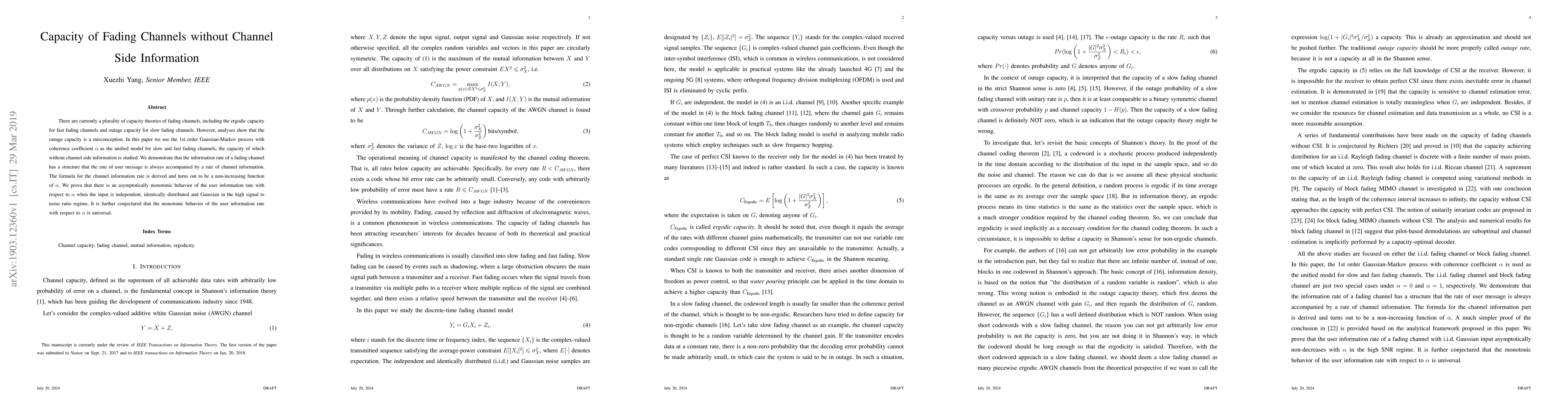 There are currently a plurality of capacity theories of fading channels, including the ergodic capacity for fast fading channels and outage capacity for slow fading channels. However, analyses show that the outage capacity is a misconception. In this paper we use the 1st order Gaussian-Markov process with coherence coefficient $\alpha$ as the unified model for slow and fast fading channels, the capacity of which without channel side information is studied. We demonstrate that the information rate of a fading channel has a structure that the rate of user message is always accompanied by a rate of channel information. The formula for the channel information rate is derived and turns out to be a non-increasing function of $\alpha$. We prove that there is an asymptotically monotonic behavior of the user information rate with respect to $\alpha$ when the input is independent, identically distributed and Gaussian in the high signal to noise ratio regime. It is further conjectured that the monotonic behavior of the user information rate with respect to $\alpha$ is universal.