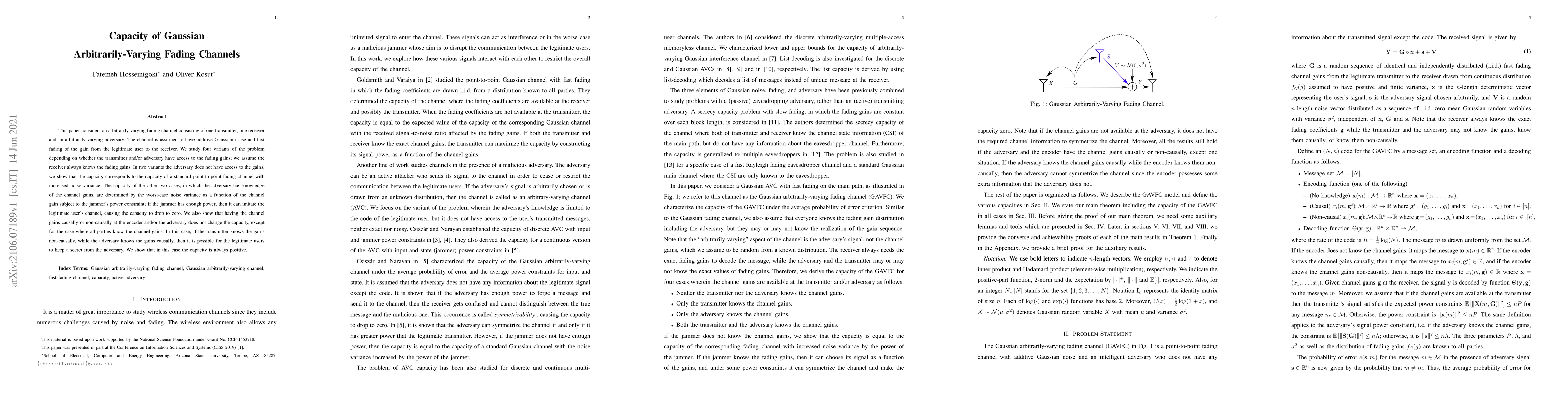 This paper considers an arbitrarily-varying fading channel consisting of one transmitter, one receiver and an arbitrarily varying adversary. The channel is assumed to have additive Gaussian noise and fast fading of the gain from the legitimate user to the receiver. We study four variants of the problem depending on whether the transmitter and/or adversary have access to the fading gains; we assume the receiver always knows the fading gains. In two variants the adversary does not have access to the gains, we show that the capacity corresponds to the capacity of a standard point-to-point fading channel with increased noise variance. The capacity of the other two cases, in which the adversary has knowledge of the channel gains, are determined by the worst-case noise variance as a function of the channel gain subject to the jammer's power constraint; if the jammer has enough power, then it can imitate the legitimate user's channel, causing the capacity to drop to zero. We also show that having the channel gains causally or non-causally at the encoder and/or the adversary does not change the capacity, except for the case where all parties know the channel gains. In this case, if the transmitter knows the gains non-causally, while the adversary knows the gains causally, then it is possible for the legitimate users to keep a secret from the adversary. We show that in this case the capacity is always positive.