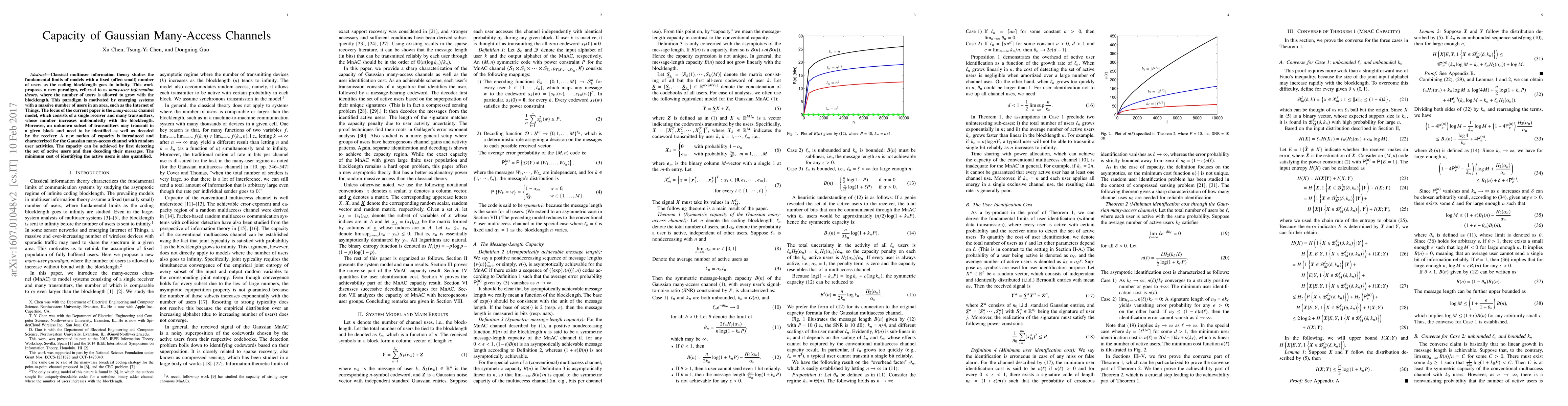 Classical multiuser information theory studies the fundamental limits of models with a fixed (often small) number of users as the coding blocklength goes to infinity. This work proposes a new paradigm, referred to as {\em many-user information theory}, where the number of users is allowed to grow with the blocklength. This paradigm is motivated by emerging systems with a massive number of users in an area, such as machine-to-machine communication systems and sensor networks. The focus of the current paper is the {\em many-access} channel model, which consists of a single receiver and many transmitters, whose number increases unboundedly with the blocklength. Moreover, an unknown subset of transmitters may transmit in a given block and need to be identified. A new notion of capacity is introduced and characterized for the Gaussian many-access channel with random user activities. The capacity can be achieved by first detecting the set of active users and then decoding their messages.
