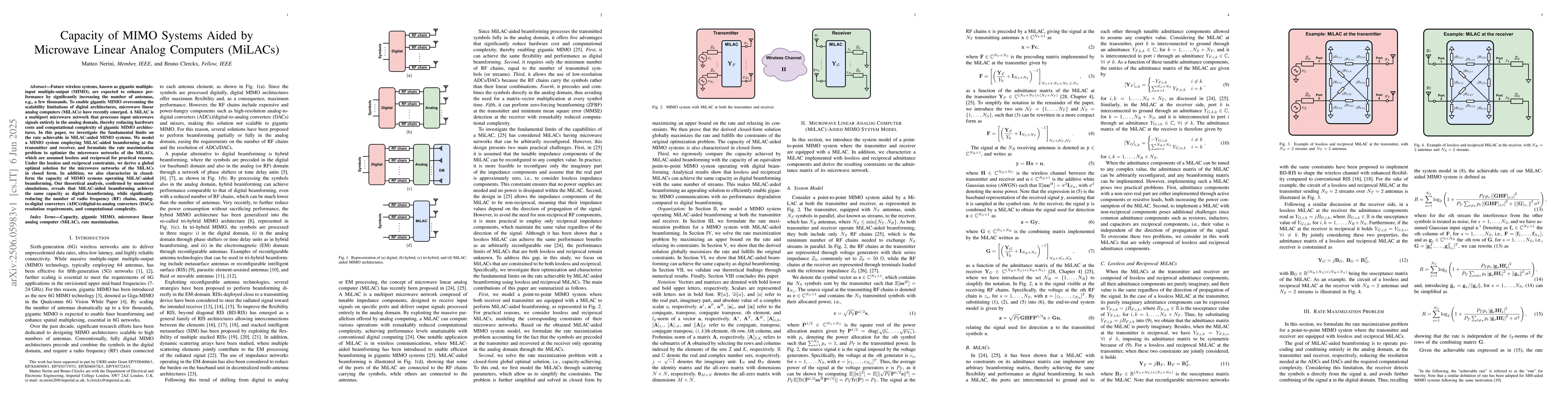 Future wireless systems, known as gigantic multiple-input multiple-output (MIMO), are expected to enhance performance by significantly increasing the number of antennas, e.g., a few thousands. To enable gigantic MIMO overcoming the scalability limitations of digital architectures, microwave linear analog computers (MiLACs) have recently emerged. A MiLAC is a multiport microwave network that processes input microwave signals entirely in the analog domain, thereby reducing hardware costs and computational complexity of gigantic MIMO architectures. In this paper, we investigate the fundamental limits on the rate achievable in MiLAC-aided MIMO systems. We model a MIMO system employing MiLAC-aided beamforming at the transmitter and receiver, and formulate the rate maximization problem to optimize the microwave networks of the MiLACs, which are assumed lossless and reciprocal for practical reasons. Under the lossless and reciprocal constraints, we derive a global optimal solution for the microwave networks of the MiLACs in closed form. In addition, we also characterize in closed-form the capacity of MIMO systems operating MiLAC-aided beamforming. Our theoretical analysis, confirmed by numerical simulations, reveals that MiLAC-aided beamforming achieves the same capacity as digital beamforming, while significantly reducing the number of radio frequency (RF) chains, analog-to-digital converters (ADCs)/digital-to-analog converters (DACs) resolution requirements, and computational complexity.