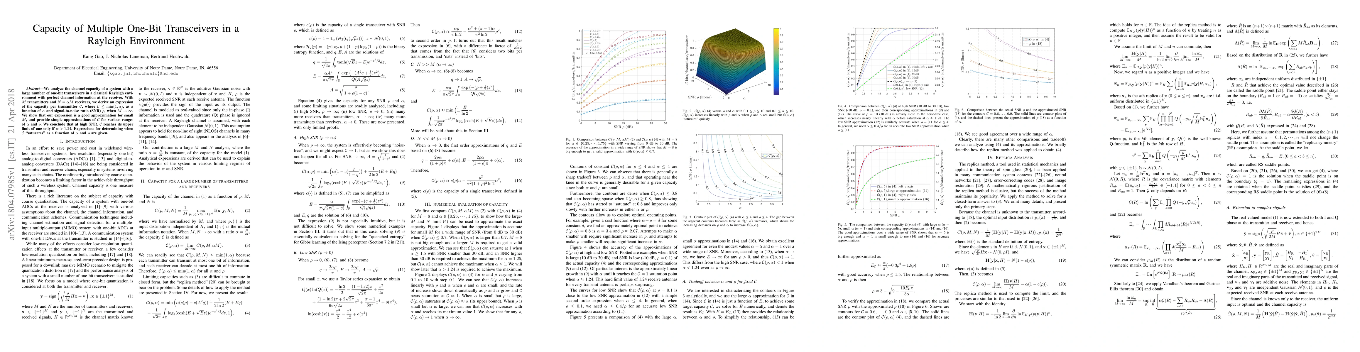 A study on a system with multiple one-bit transceivers in a Rayleigh environment finds that the channel capacity per transmitter reaches its upper limit of one only if the ratio of receivers to transmitters is greater than 1.24 at high signal-to-noise ratios.
