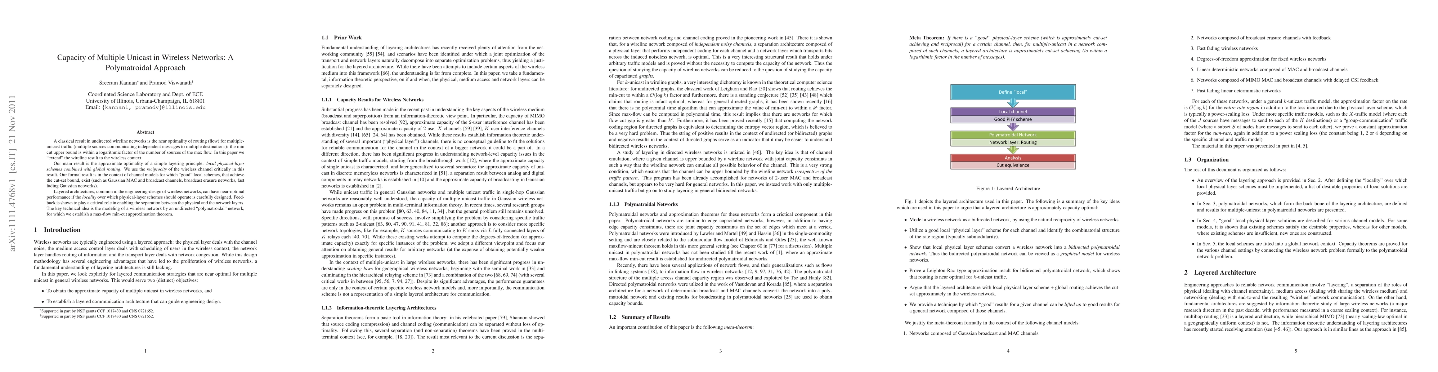 A classical result in undirected wireline networks is the near optimality of routing (flow) for multiple-unicast traffic (multiple sources communicating independent messages to multiple destinations): the min cut upper bound is within a logarithmic factor of the number of sources of the max flow. In this paper we "extend" the wireline result to the wireless context. Our main result is the approximate optimality of a simple layering principle: {\em local physical-layer schemes combined with global routing}. We use the {\em reciprocity} of the wireless channel critically in this result. Our formal result is in the context of channel models for which "good" local schemes, that achieve the cut-set bound, exist (such as Gaussian MAC and broadcast channels, broadcast erasure networks, fast fading Gaussian networks). Layered architectures, common in the engineering-design of wireless networks, can have near-optimal performance if the {\em locality} over which physical-layer schemes should operate is carefully designed. Feedback is shown to play a critical role in enabling the separation between the physical and the network layers. The key technical idea is the modeling of a wireless network by an undirected "polymatroidal" network, for which we establish a max-flow min-cut approximation theorem.
