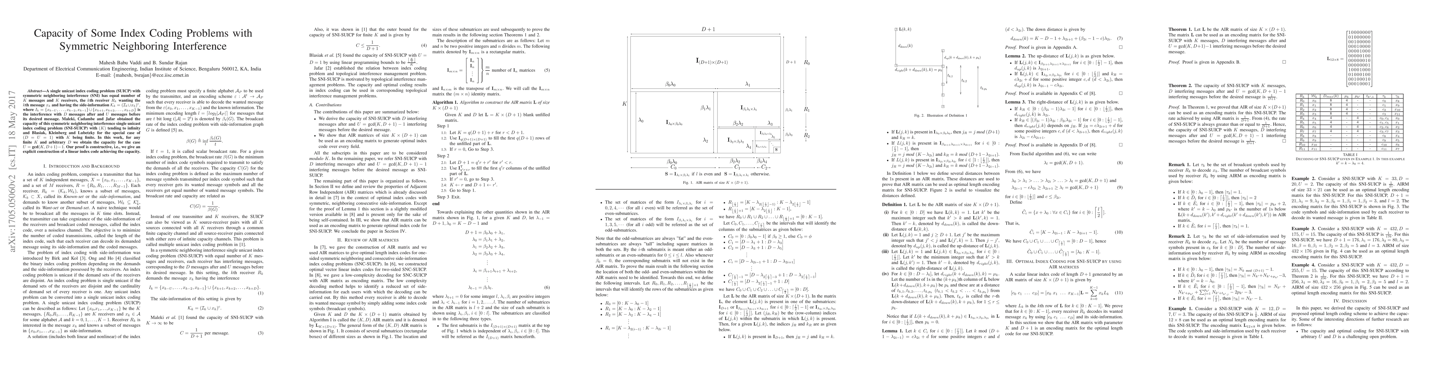 Researchers found a capacity for single unicast index coding problems with symmetric neighboring interference, providing an explicit construction of a linear index code achieving the capacity for finite K and arbitrary D.