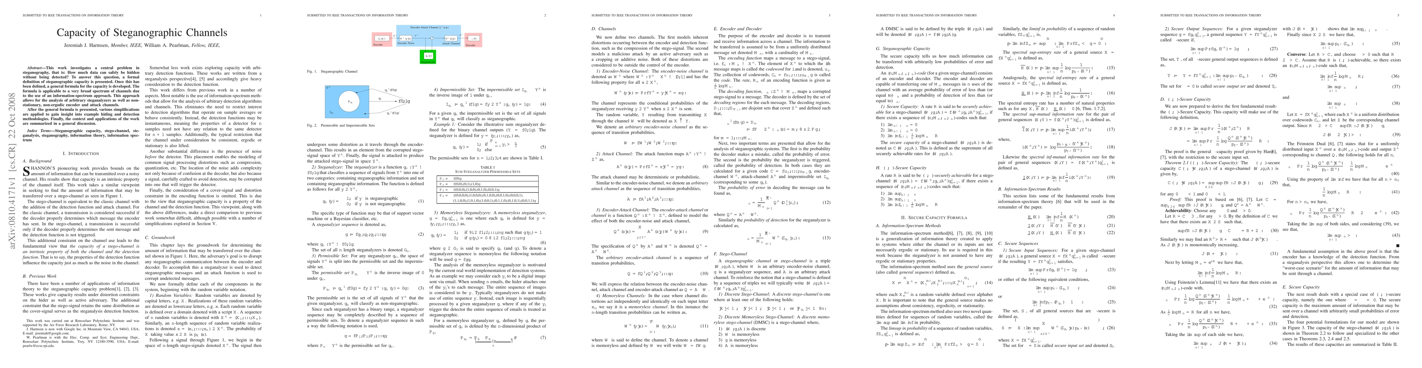 This paper defines steganographic capacity as a formal concept and develops a general formula to estimate how much data can safely be hidden without detection. The formula applies to various channels using an information-spectrum approach, providing insights into hiding and detection methodologies.