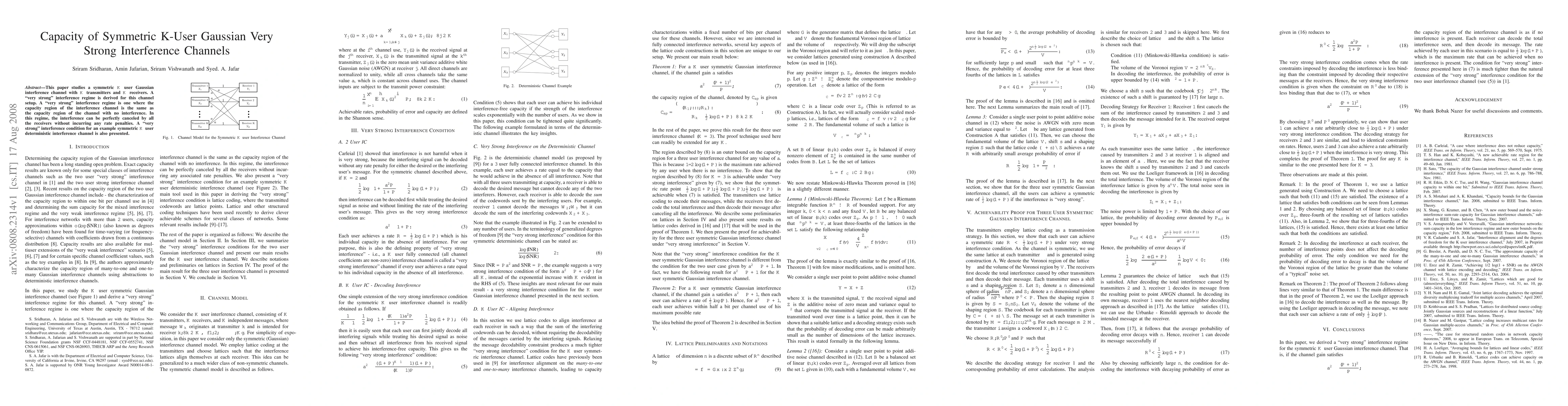 This paper explores the capacity region of a symmetric K-user Gaussian interference channel under "very strong" interference conditions, where interference can be perfectly canceled without rate penalties. It also presents a "very strong" interference condition for a symmetric K-user deterministic interference channel.