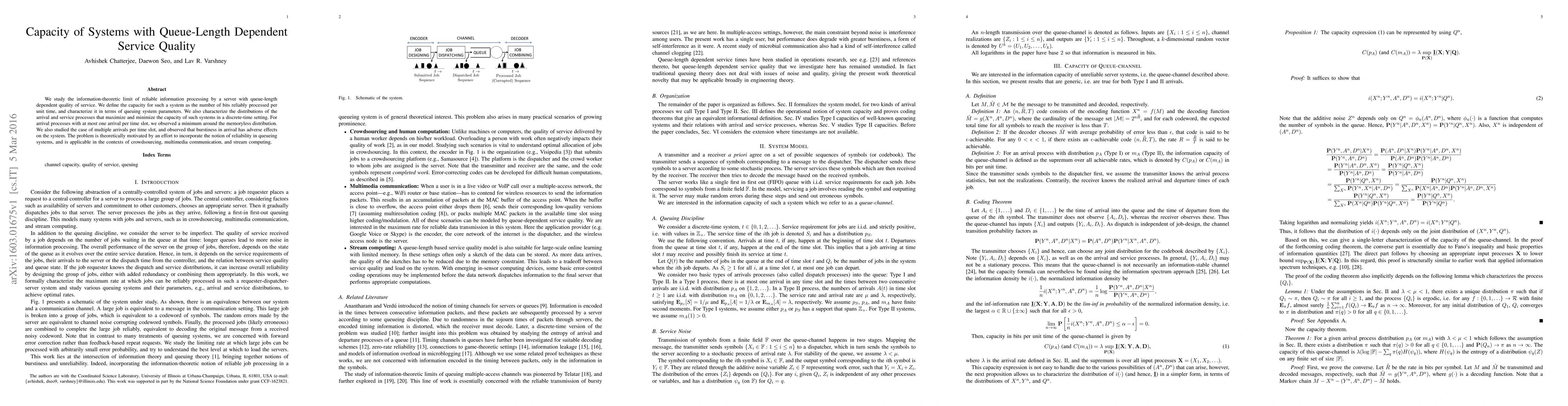 This paper investigates the capacity of systems where service quality varies with queue length, defining capacity as the number of bits processed per unit time. It characterizes the capacity in terms of queuing parameters and identifies optimal and suboptimal arrival distributions, finding that bursty arrivals reduce capacity. The study has implications for crowdsourcing, multimedia communication, and stream computing.