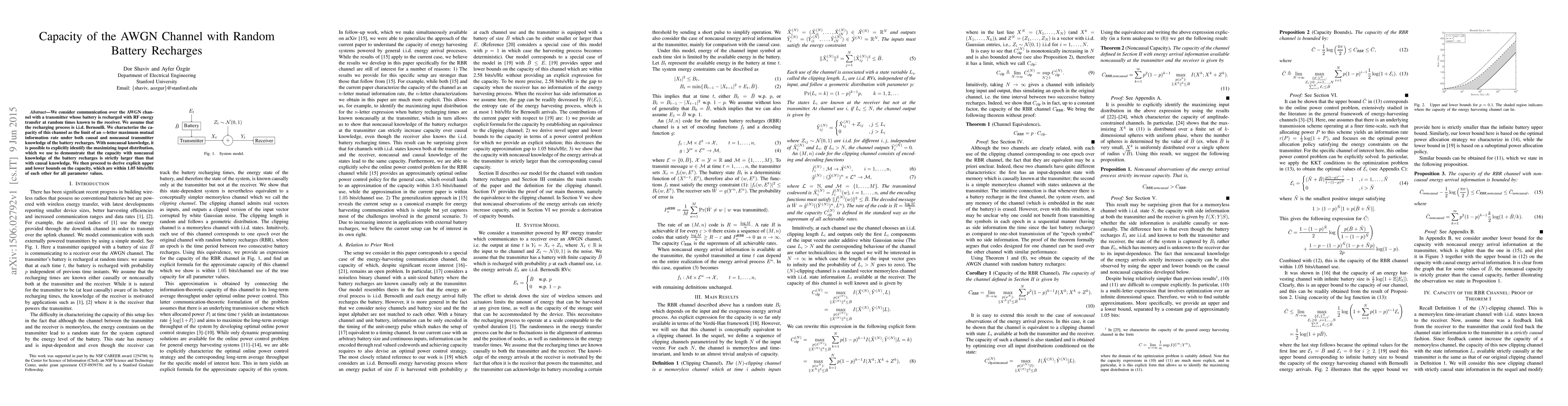 This paper investigates the capacity of an AWGN channel where the transmitter's battery is recharged randomly via RF energy transfer. It shows that noncausal knowledge of recharges allows for a higher capacity than causal knowledge, and provides tight bounds on the channel capacity.