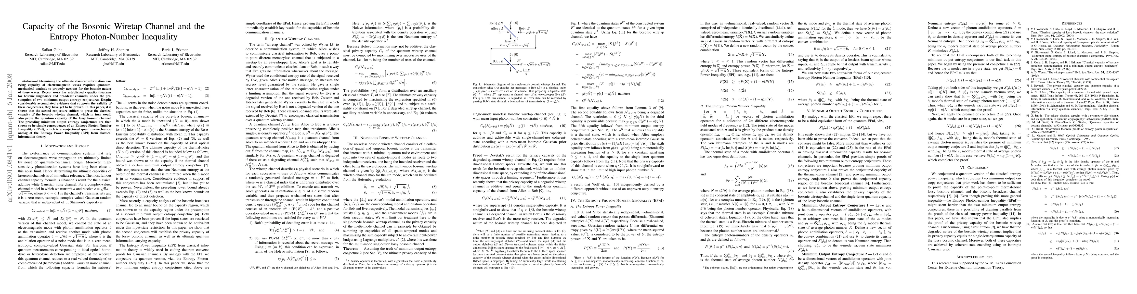 Determining the ultimate classical information carrying capacity of electromagnetic waves requires quantum-mechanical analysis to properly account for the bosonic nature of these waves. Recent work has established capacity theorems for bosonic single-user and broadcast channels, under the presumption of two minimum output entropy conjectures. Despite considerable accumulated evidence that supports the validity of these conjectures, they have yet to be proven. In this paper, it is shown that the second conjecture suffices to prove the classical capacity of the bosonic wiretap channel, which in turn would also prove the quantum capacity of the lossy bosonic channel. The preceding minimum output entropy conjectures are then shown to be simple consequences of an Entropy Photon-Number Inequality (EPnI), which is a conjectured quantum-mechanical analog of the Entropy Power Inequality (EPI) form classical information theory.
