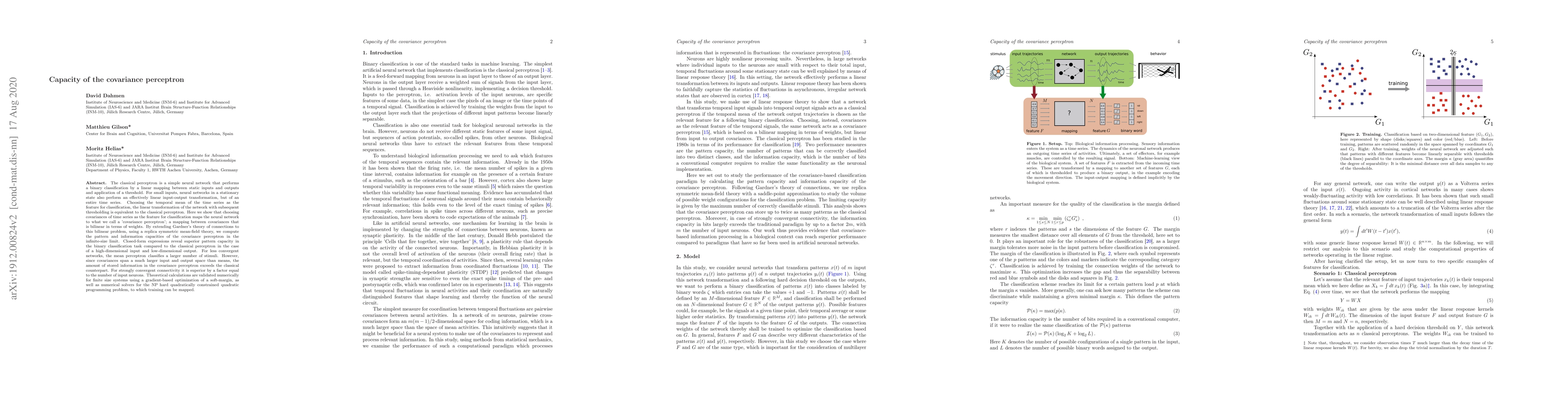 The paper introduces the "covariance perceptron," a neural network variant that uses covariances of time series as features for classification, showing superior pattern capacity compared to the classical perceptron, especially for high-dimensional inputs and low-dimensional outputs. The theoretical findings are validated through numerical simulations.