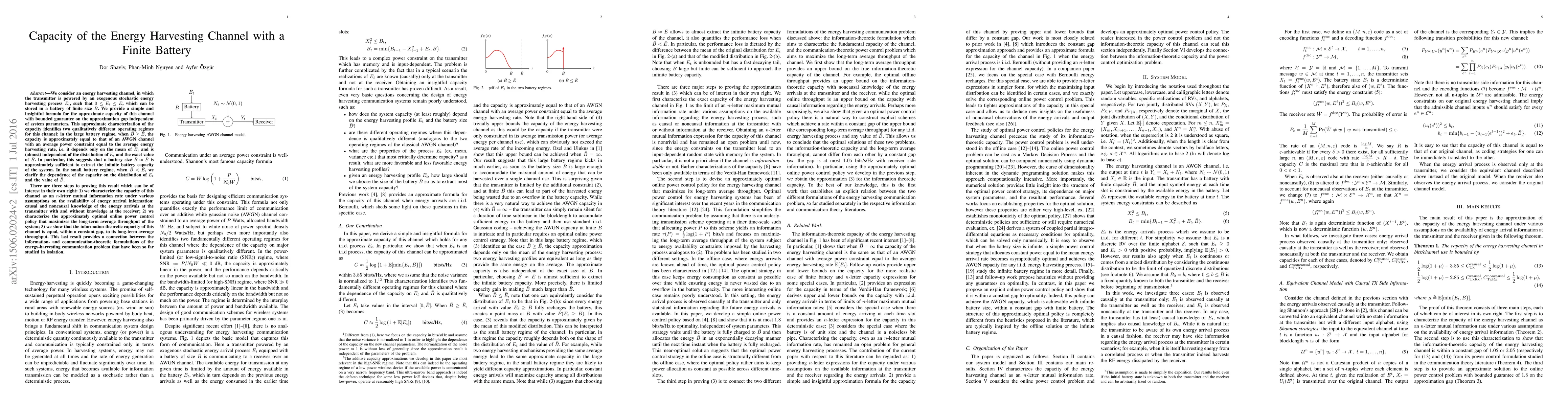 We consider an energy harvesting channel, in which the transmitter is powered by an exogenous stochastic energy harvesting process $E_t$, such that $0\leq E_t\leq\bar{E}$, which can be stored in a battery of finite size $\bar{B}$. We provide a simple and insightful formula for the approximate capacity of this channel with bounded guarantee on the approximation gap independent of system parameters. This approximate characterization of the capacity identifies two qualitatively different operating regimes for this channel: in the large battery regime, when $\bar{B}\geq \bar{E}$, the capacity is approximately equal to that of an AWGN channel with an average power constraint equal to the average energy harvesting rate, i.e. it depends only on the mean of $E_t$ and is (almost) independent of the distribution of $E_t$ and the exact value of $\bar{B}$. In particular, this suggests that a battery size $\bar{B}\approx\bar{E}$ is approximately sufficient to extract the infinite battery capacity of the system. In the small battery regime, when $\bar{B}<\bar{E}$, we clarify the dependence of the capacity on the distribution of $E_t$ and the value of $\bar{B}$. There are three steps to proving this result which can be of interest in their own right: 1) we characterize the capacity of this channel as an $n$-letter mutual information rate under various assumptions on the availability of energy arrival information; 2) we characterize the approximately optimal online power control policy that maximizes the long-term average throughput of the system; 3) we show that the information-theoretic capacity of this channel is equal, within a constant gap, to its long-term average throughput. This last result provides a connection between the information- and communication-theoretic formulations of the energy-harvesting communication problem that have been so far studied in isolation.