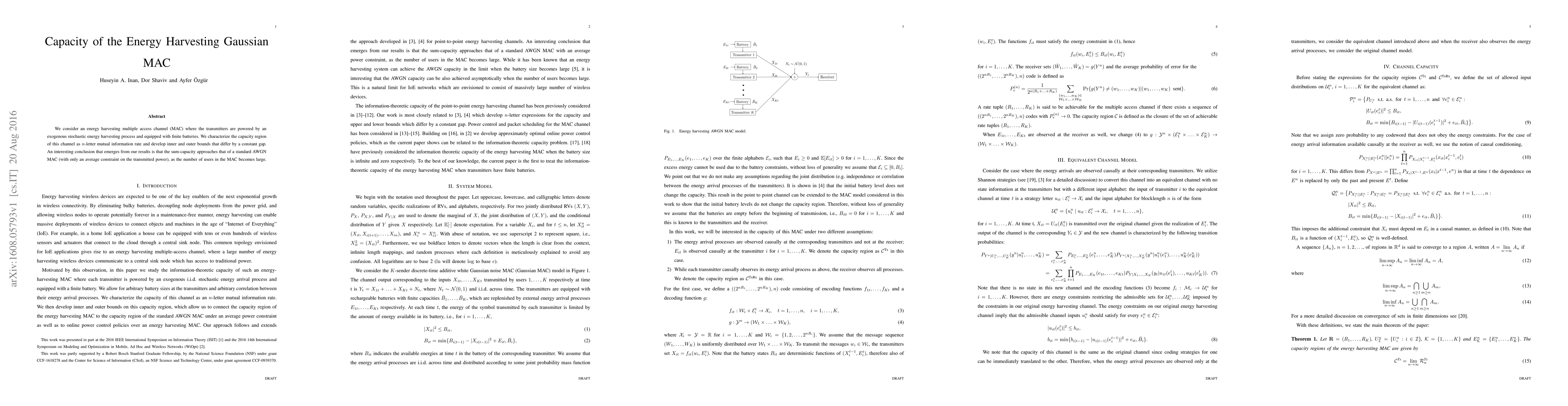 We consider an energy harvesting multiple access channel (MAC) where the transmitters are powered by an exogenous stochastic energy harvesting process and equipped with finite batteries. We characterize the capacity region of this channel as n-letter mutual information rate and develop inner and outer bounds that differ by a constant gap. An interesting conclusion that emerges from our results is that the sum-capacity approaches that of a standard AWGN MAC (with only an average constraint on the transmitted power), as the number of users in the MAC becomes large.