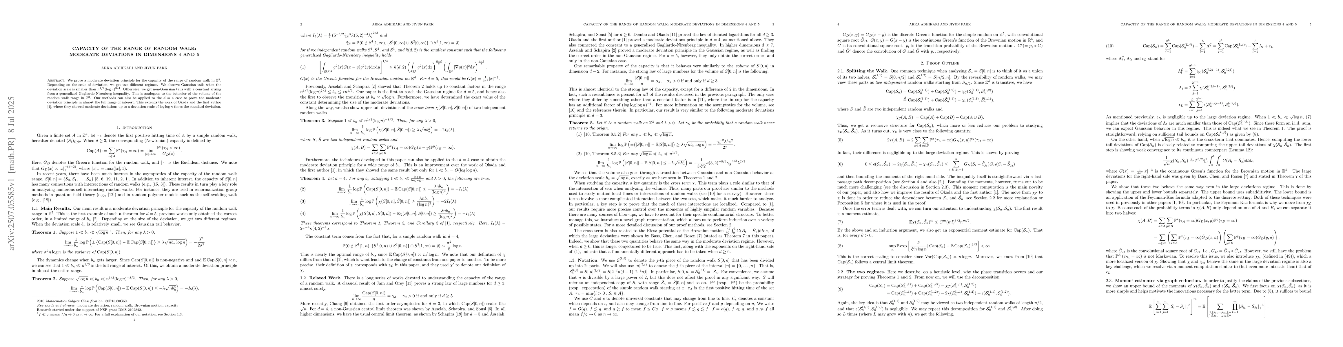 We prove a moderate deviation principle for the capacity of the range of random walk in $\mathbb{Z}^5$. Depending on the scale of deviation, we get two different regimes. We observe Gaussian tails when the deviation scale is smaller than $n^{1/2} (\log n)^{3/4}$. Otherwise, we get non-Gaussian tails with a constant arising from a generalized Gagliardo-Nirenberg inequality. This is analogous to the behavior of the volume of the random walk range in $\mathbb{Z}^3$. Our methods can also be applied to the $d = 4$ case to prove the moderate deviation principle in almost the full range of interest. This extends the work of Okada and the first author \cite{AdhikariOkada2023}, where they showed moderate deviations up to a deviation scale of $\log \log n$ times the standard deviation.