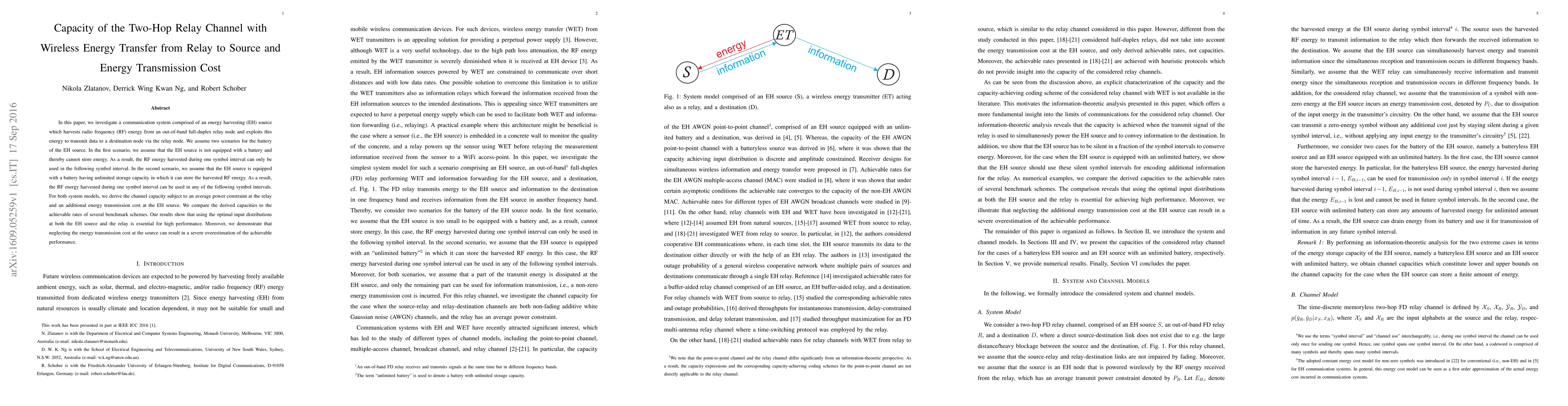 In this paper, we investigate a communication system comprised of an energy harvesting (EH) source which harvests radio frequency (RF) energy from an out-of-band full-duplex relay node and exploits this energy to transmit data to a destination node via the relay node. We assume two scenarios for the battery of the EH source. In the first scenario, we assume that the EH source is not equipped with a battery and thereby cannot store energy. As a result, the RF energy harvested during one symbol interval can only be used in the following symbol interval. In the second scenario, we assume that the EH source is equipped with a battery having unlimited storage capacity in which it can store the harvested RF energy. As a result, the RF energy harvested during one symbol interval can be used in any of the following symbol intervals. For both system models, we derive the channel capacity subject to an average power constraint at the relay and an additional energy transmission cost at the EH source. We compare the derived capacities to the achievable rates of several benchmark schemes. Our results show that using the optimal input distributions at both the EH source and the relay is essential for high performance. Moreover, we demonstrate that neglecting the energy transmission cost at the source can result in a severe overestimation of the achievable performance.