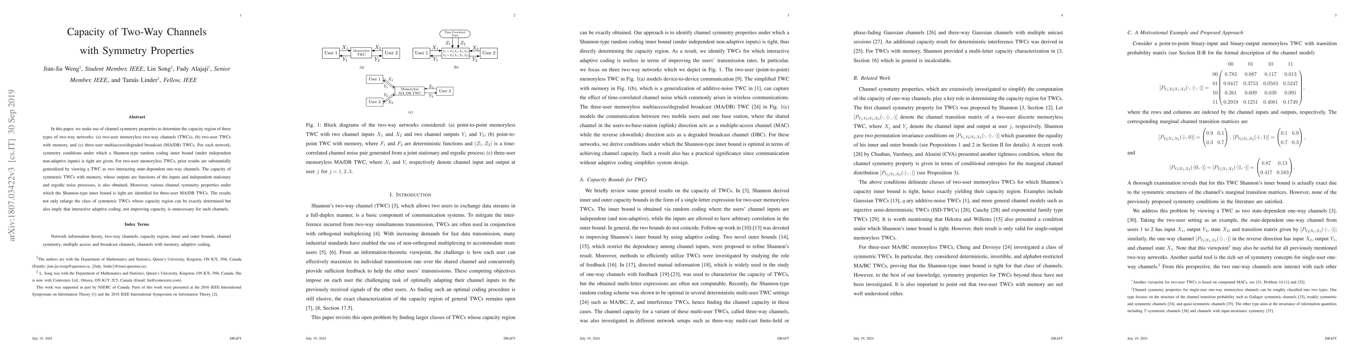 This paper explores the capacity region of symmetric two-way channels, including memoryless and memory-equipped two-user networks and three-user multiaccess/degraded broadcast networks, demonstrating that adaptive coding does not enhance capacity for these symmetric channels. The study generalizes prior results for memoryless TWCs and identifies conditions under which Shannon-type inner bounds are tight, expanding the class of solvable symmetric two-way channels.