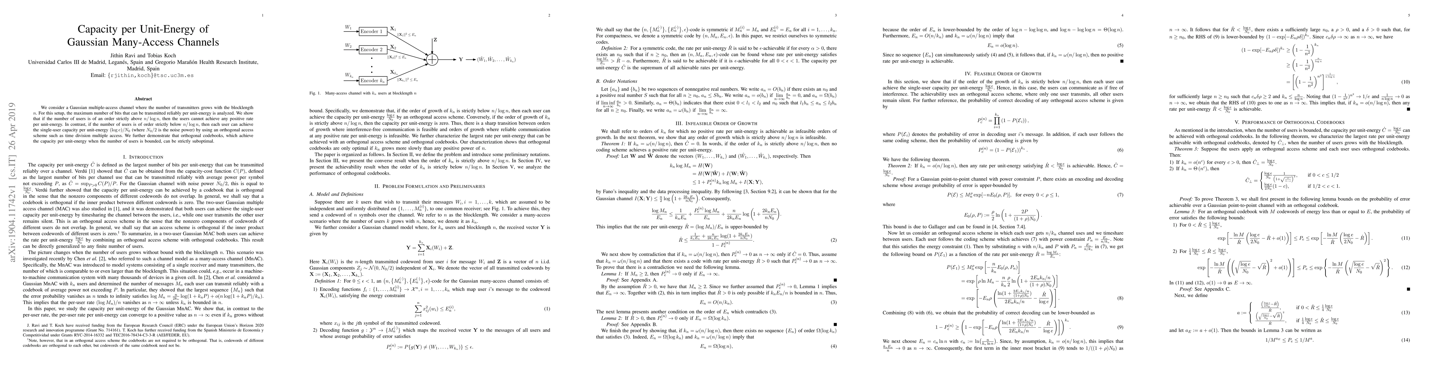 This paper analyzes the capacity per unit-energy of Gaussian multiple-access channels with a growing number of transmitters. It finds that when the number of users exceeds $n/\log n$, no positive rate per unit-energy is achievable, while below this threshold, each user can achieve single-user capacity per unit-energy using orthogonal access schemes.