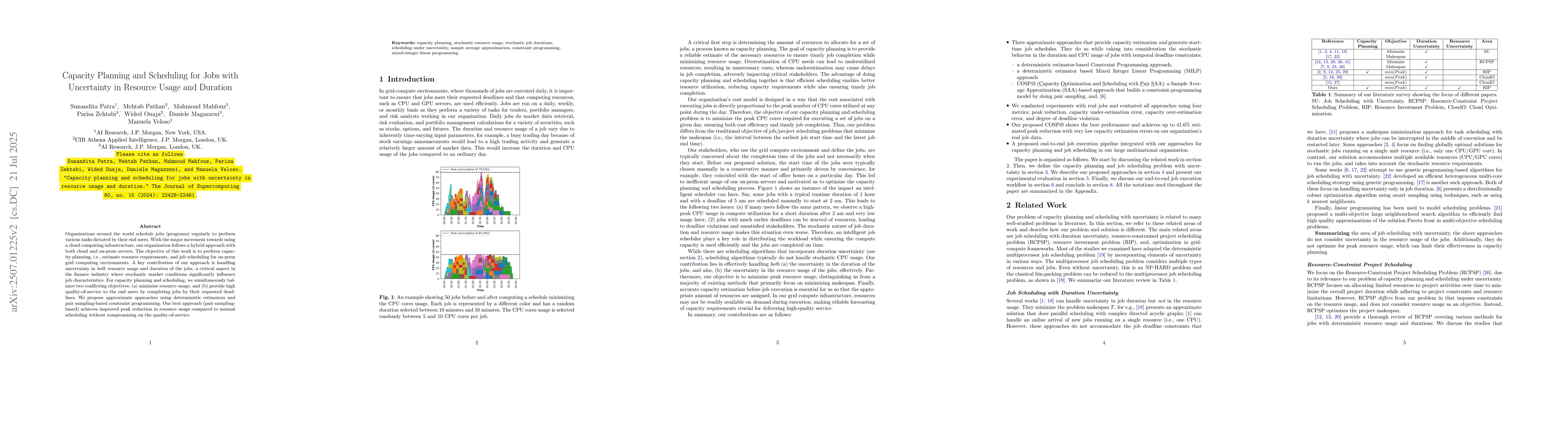 Organizations around the world schedule jobs (programs) regularly to perform various tasks dictated by their end users. With the major movement towards using a cloud computing infrastructure, our organization follows a hybrid approach with both cloud and on-prem servers. The objective of this work is to perform capacity planning, i.e., estimate resource requirements, and job scheduling for on-prem grid computing environments. A key contribution of our approach is handling uncertainty in both resource usage and duration of the jobs, a critical aspect in the finance industry where stochastic market conditions significantly influence job characteristics. For capacity planning and scheduling, we simultaneously balance two conflicting objectives: (a) minimize resource usage, and (b) provide high quality-of-service to the end users by completing jobs by their requested deadlines. We propose approximate approaches using deterministic estimators and pair sampling-based constraint programming. Our best approach (pair sampling-based) achieves much lower peak resource usage compared to manual scheduling without compromising on the quality-of-service.