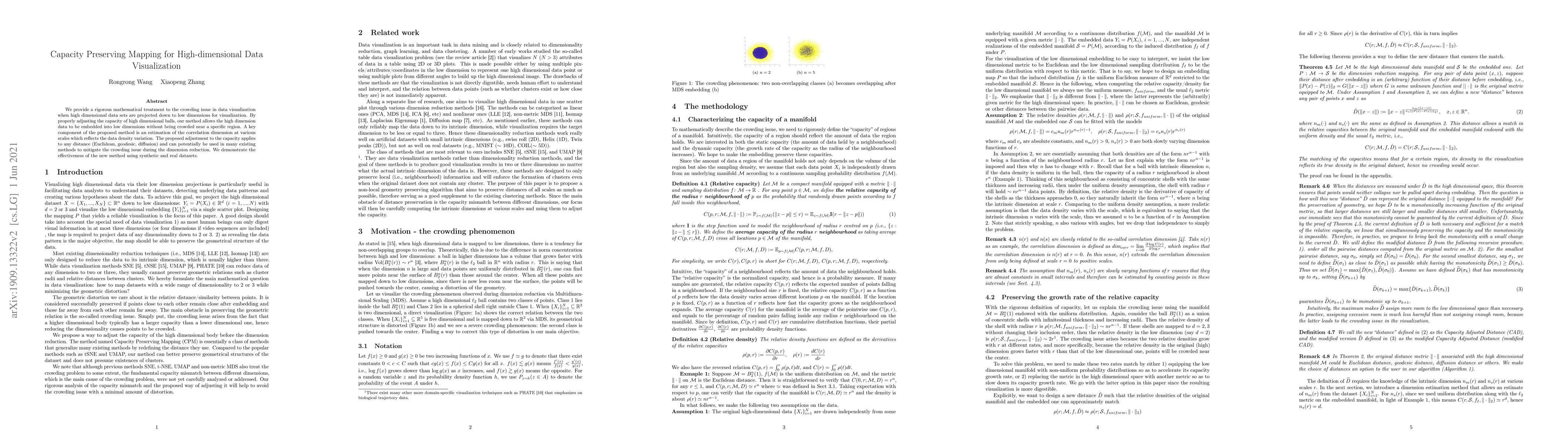 This paper introduces a mathematical approach to address the crowding issue in visualizing high-dimensional data by adjusting the capacity of high-dimensional balls to accommodate data density variations. The method estimates the correlation dimension at various scales and can be applied to different distance metrics to improve existing dimension reduction techniques.