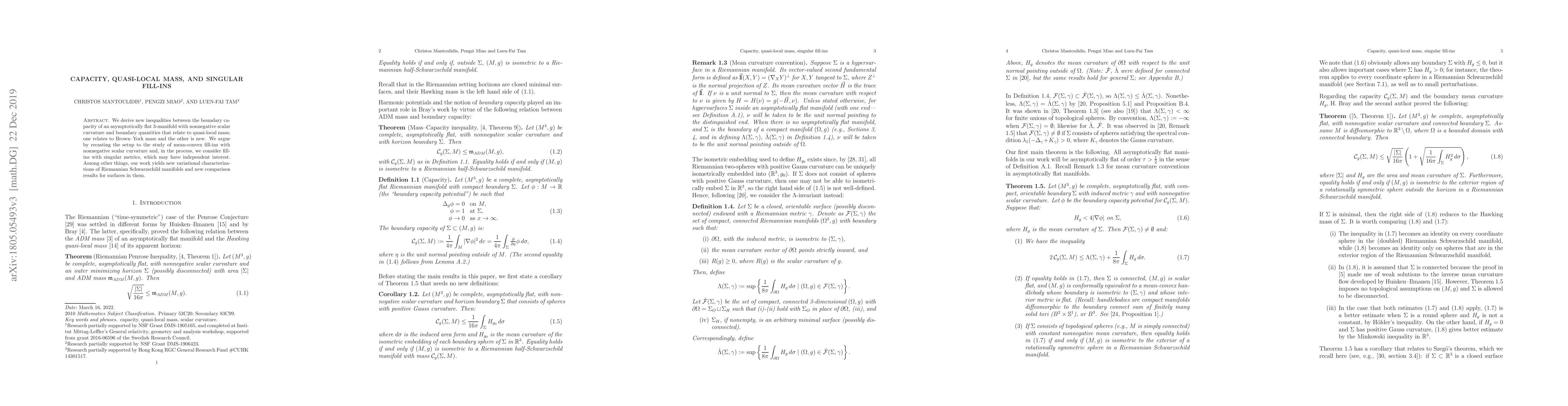 This paper derives new inequalities linking the boundary capacity of asymptotically flat 3-manifolds with nonnegative scalar curvature to quasi-local mass concepts, including Brown-York mass and a novel measure. The study also explores mean-convex fill-ins with singular metrics, yielding variational characterizations of Riemannian Schwarzschild manifolds and comparison results for surfaces within them.